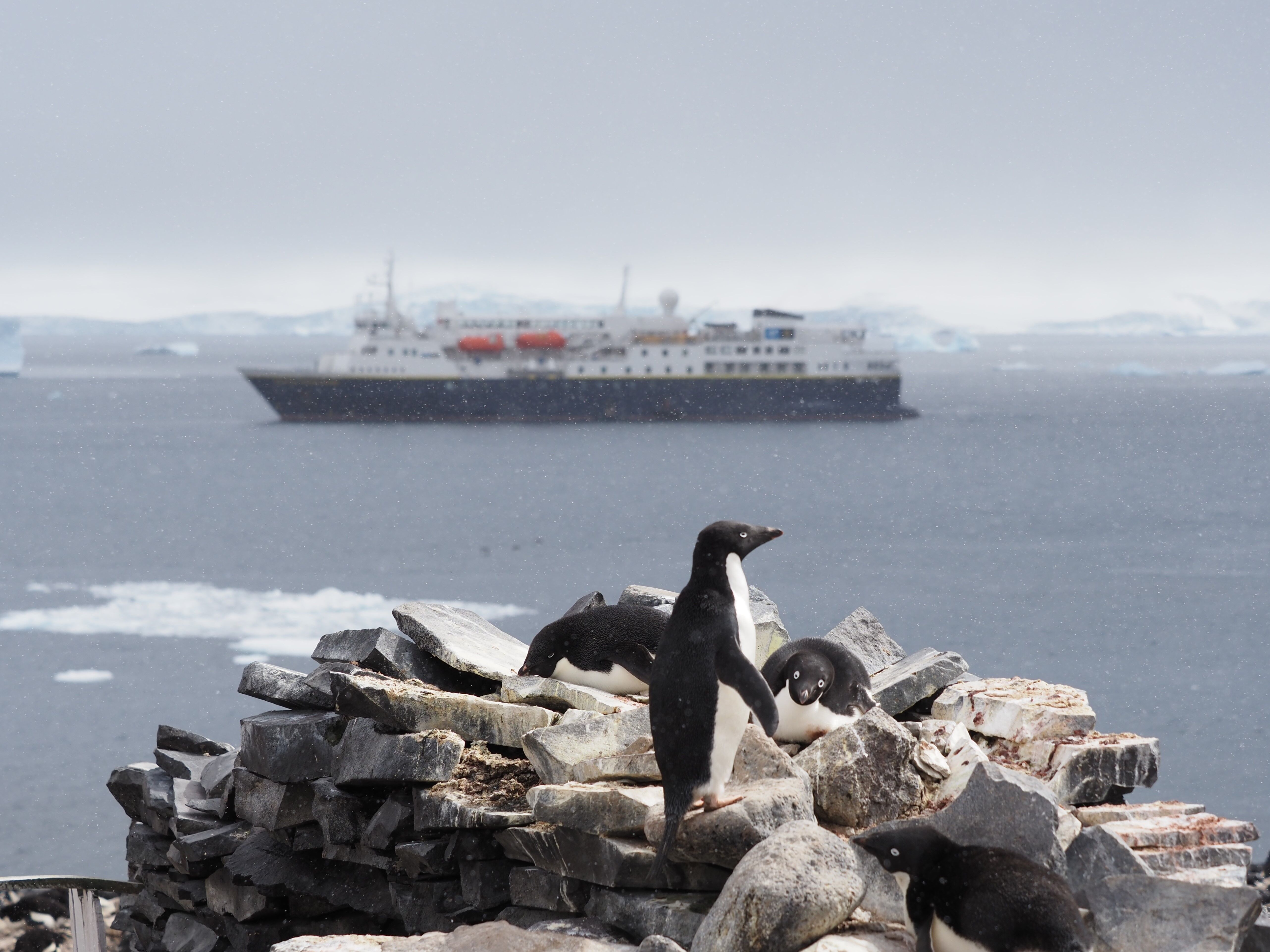 Blue skies, relatively calm seas, and an abundance of seabirds beckoned us on deck today as we steamed due south towards the western Antarctic Peninsula. It was surprising to see our first iceberg before entering the cold seas of the Southern Ocean. The towering berg partially collapsed before our eyes, creating a huge splash as we watched seabirds from the aft deck. Several brief snow showers descended on us as we approached the colder waters of the Southern Ocean at around 60 degrees south; the sea temperature dropped from 4.5 to 2 degrees Celsius. Now we are truly in the Southern Ocean! From Naturalist Doug Gualtieri, we learned about the seabirds that call this unforgiving environment their home. It was superb to be graced by the very species that he was talking about. Our species tally for the day was ten petrel and five albatross species.