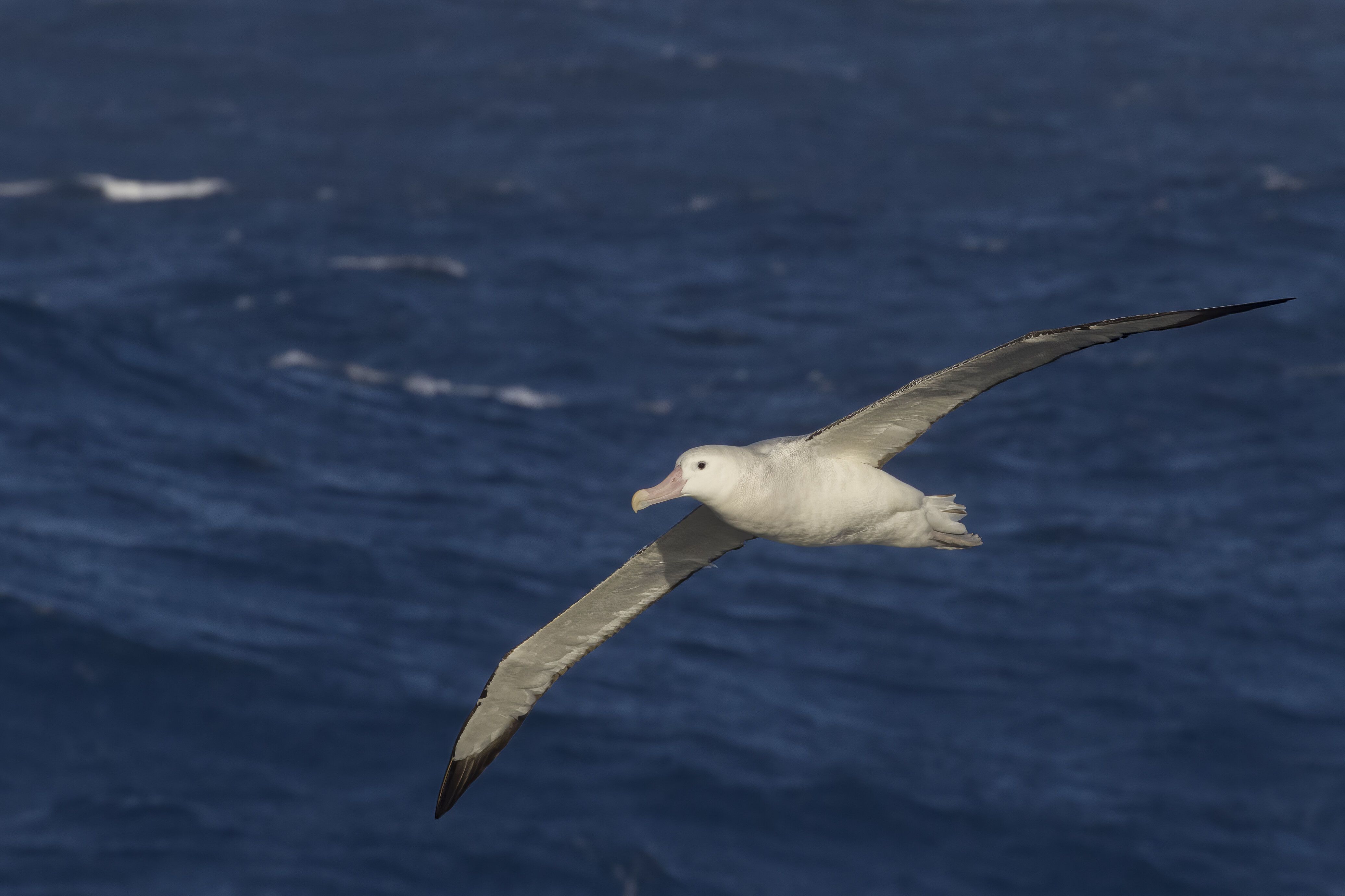 I love the open ocean, and the Drake Passage offers a chance to watch some of the most spectacular birds on earth, the albatrosses. Early this morning, I grabbed my parka and my camera and headed out to the sun deck. As I opened the door, the clean, cold air hit my face, and I saw it almost immediately: a wandering albatross! All albatross species are very impressive birds. They are capable of gliding over the ocean in incredibly long journeys to look for food. They can cover entire ocean basins. Their long and narrow wings are perfectly adapted to ride the wind with no apparent movement. They can lock special joints in their shoulders and elbows that allow them to travel long distances with very low energy costs. Their long wings have accompanied ships for centuries, and albatrosses are an important component of many legends, superstitions, and songs among sailors. The longest wings belong to the wandering albatross. The wingspan of some individuals measures in at an impossible 12 feet, giving these birds the longest wingspan on the planet. Today we had the pleasure and the honor of watching not one but several individuals throughout the day. We also observed several black-browed albatrosses, a single gray-headed albatross, and a few royal albatrosses, which are almost as big as the wandering albatross. Their majestic and effortless flight delighted those of us who appreciate the beauty of truly wild creatures and places. Tomorrow we should be arriving to the South Shetland Islands, where our expedition of Antarctica will surely give us more amazing moments, but tonight I am going to dream of long wings over stormy seas.