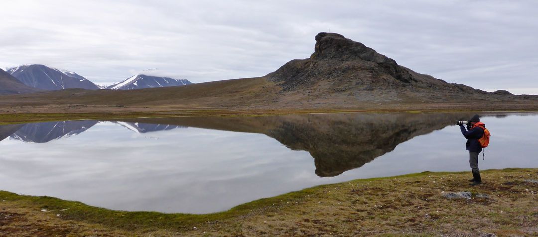 At first glance, Devon Island looks barren and desolate. It may be so in some places but not where we set foot upon the land today. Squeezed between Dundas Harbour and Johnson Bay, a narrow peninsula hosts an abundance of history. Details emerged little by little. Red-throated loons called from a freshwater lake as they drifted upon reflections of mountaintops. We walked in a willow forest half an inch tall, the “trees” here dwarfed by poppies and saxifrage. The brilliant white pelage of an Arctic hare betrayed its presence as it stood guard over an ancient archaeological site. We pondered the remains of circular Thule houses and mourned the details we may never know as one by one they are snatched by the sea.