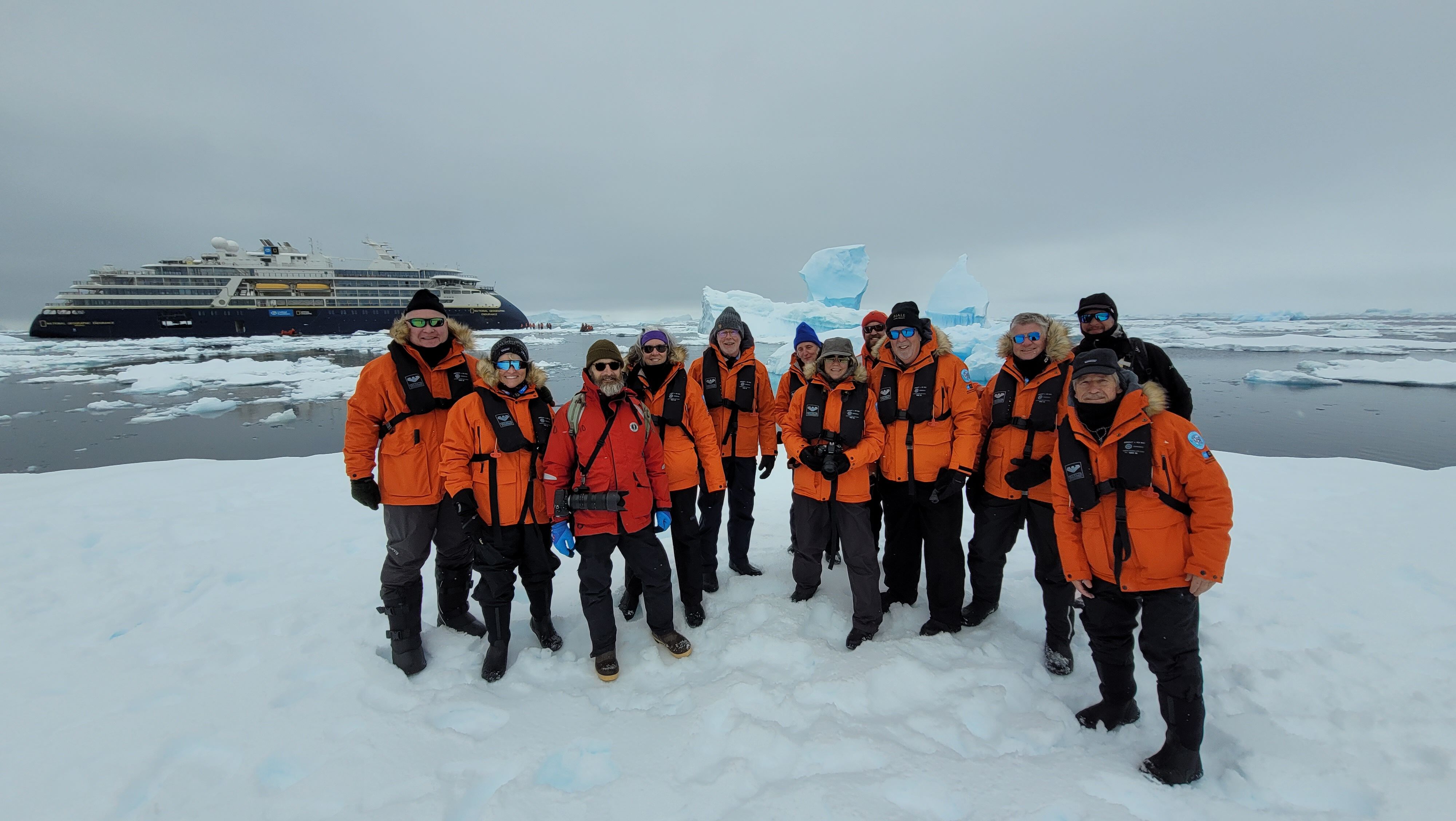The day was filled with pleasant surprises and once in a lifetime experiences for many of us. Right after breakfast, the bridge officers parked our ship directly beside the fast ice in Duse Bay. Surrounded by the Antarctic continent, we walked off the ship’s B Deck directly onto the four-foot-thick ice and explored around the vast white expanse. Some guests took classic pictures, posing in front of the bow while pretending to haul one of the ship’s lines. Others studied the details of the crystalline structure of the ice. A few times during the morning, we were visited by groups of Adélie penguins. We made room for them as they walked by our group along the fast ice.