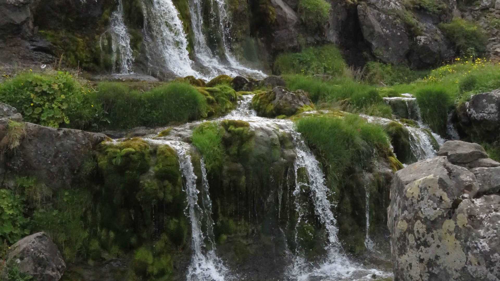 Hikers went ashore by Zodiac and begin their treks along the shore before beginning to climb the steep trail alongside the waterfalls—yes that is plural. Dynjandi is a series of seven waterfalls. The highest part of Dynjandi pours in a broad torrent over a high precipice. Fed by snowmelt and groundwater, this cascade then leaps roaring and splashing over a series of steps formed of lava flows, falling in total about 100 meters before flowing into the sea.