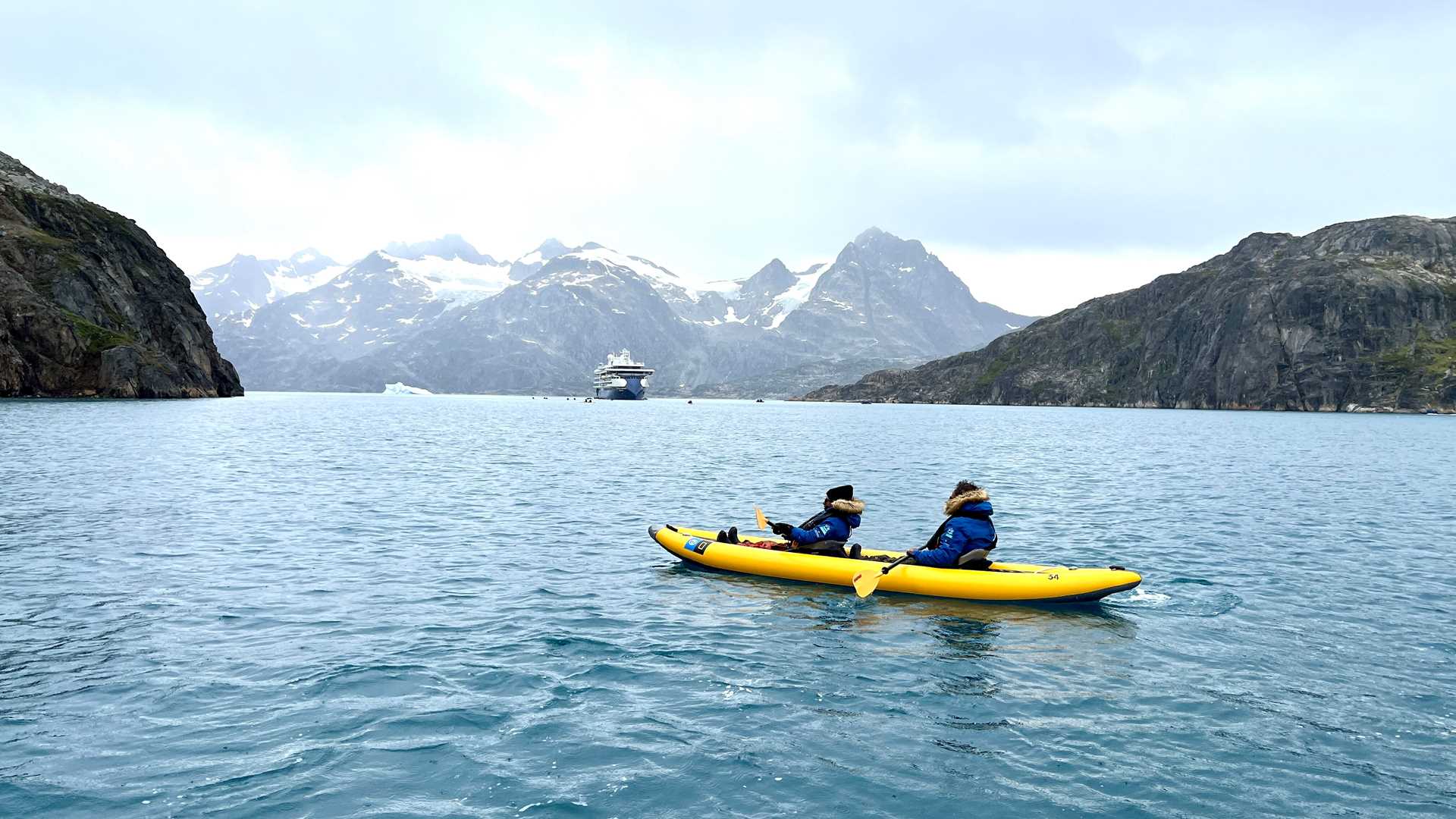 National Geographic Endurance spent the day exploring the southern reaches of East Greenland. Under some misty drizzle, a combination of Zodiac cruising and kayaking were offered after breakfast. Around us were high cliffs, and ribbons of waterfalls were a strong attraction for the kayakers. Once those operations were finished, the polar plunge was set up. Base camp was filled with cheering, laughing, and shivering guests as we had a good turnout of brave souls take the plunge.