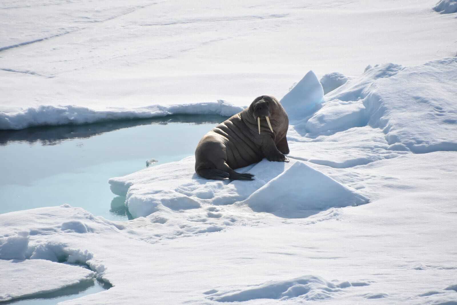 Last night had us bonking and bashing a little bit in the ice, but by the time we awoke this morning, celebration was in the air. We are the first ship to cross the north end of Spitsbergen this summer season, putting us well on our way to be the first ship to circumnavigate the island this year! Our pay off was a sighting of another polar bear! This bear was deep in the land-fast sea ice (ice “held fast” or “fastened” to land) and to conserve its icy habitat, we were not able to approach the bear. While our sighting today was distant, it always warms our hearts to see bears out on the ice being bears. Along our morning travels, several walruses were spotted resting on remnants of sea ice, just offshore. The sun was shining and everything was great!