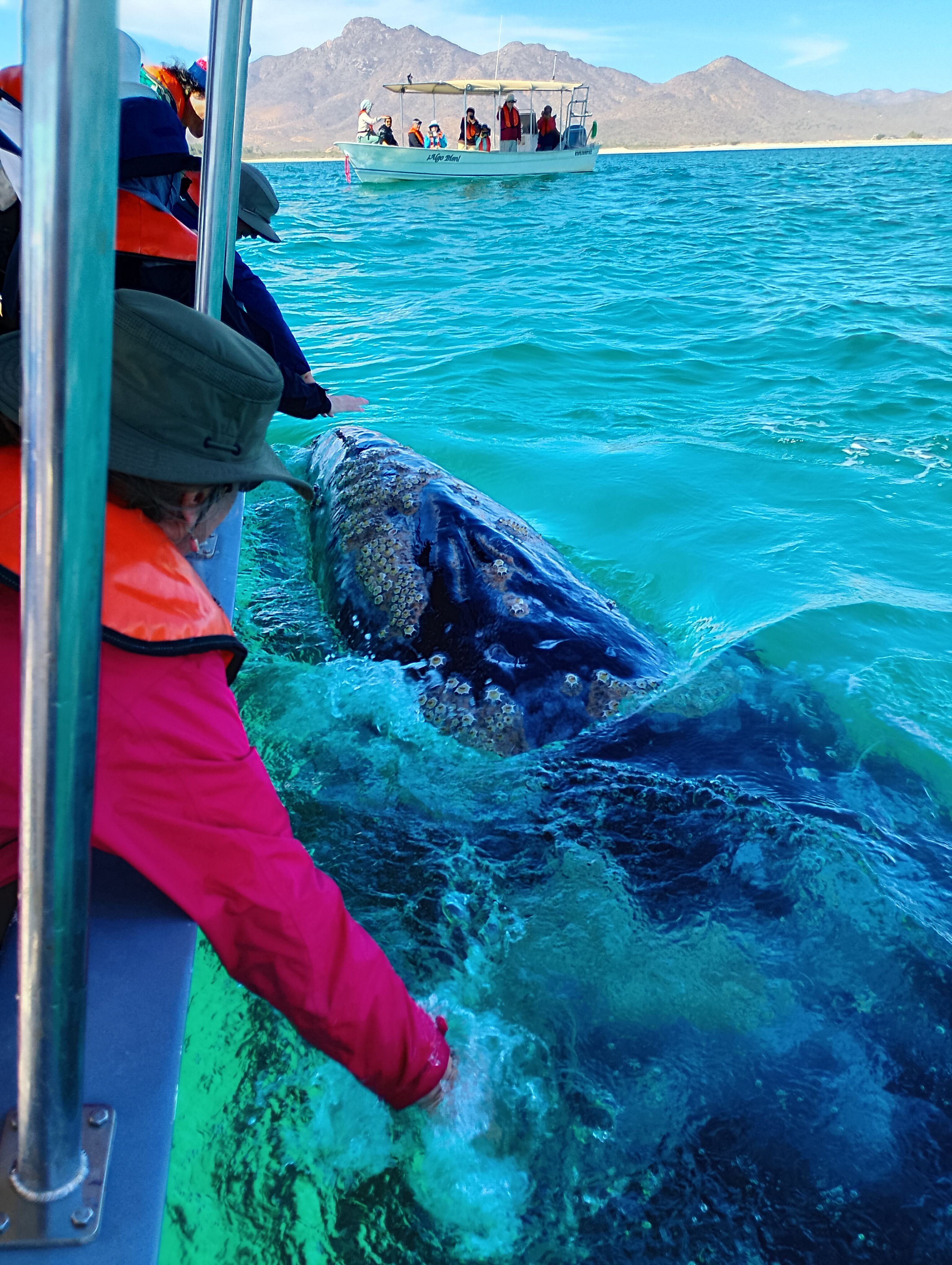 After lunch, the hotel manager opened the Global Gallery. Then our guests gathered on the bow to enjoy the beauty of the Hull Canal. We spent the afternoon whale watching with pangueros from Lopez Mateos. At Boca de la Soledad, we spotted a couple of gray whale females with their calves.
