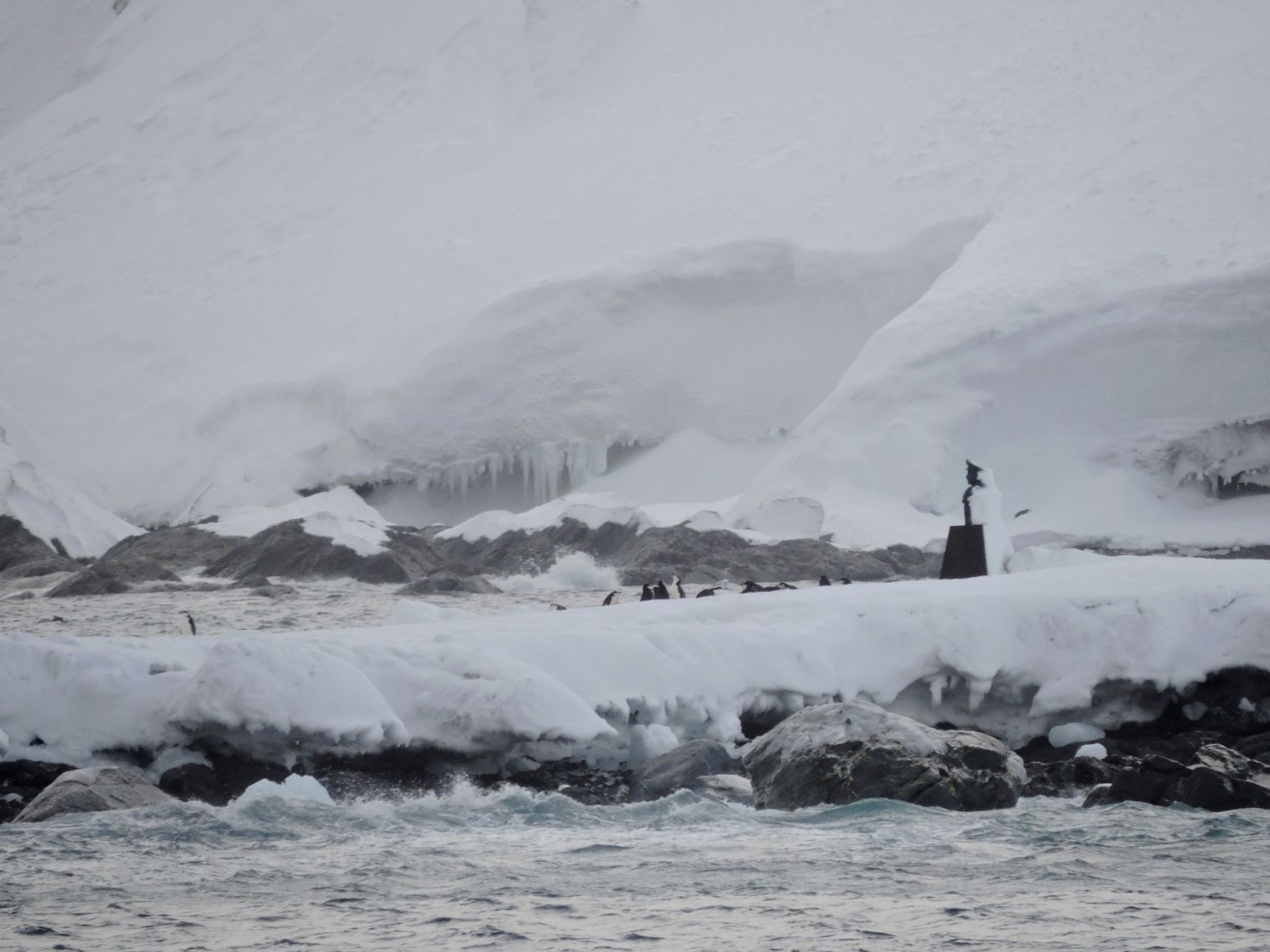 In spite of katabatic winds, complete with impressive will’o’waws, the more hardy, or perhaps fool-hardy, among us went out on Zodiac cruises that got us closer to the shore where the Endurance crew survived under two overturned boats for four desperate months.  As we cruised around the rocks, we could see a statue with the bust of Piloto Luis Pardo, the Chilean captain of the ship Yelcho that Shackleton returned with in August 1916, to finally rescue his crew on Elephant Island.  We also observed hundreds or perhaps thousands of chinstrap penguins sitting and standing around on the snow-covered rocks…waiting for the snow to dissipate, so they could build up their pebble nests and start breeding.