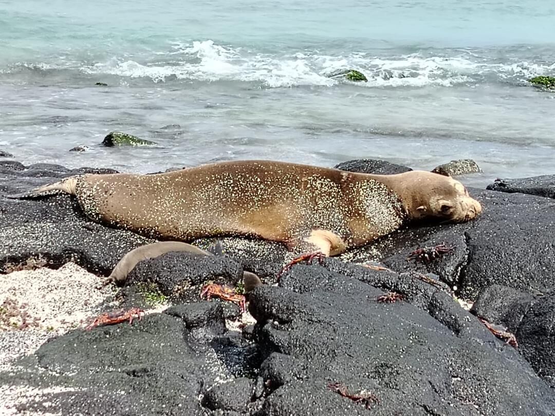 At Punta Moreno, we explored an inland trail leading to a brackish pond where a couple of American flamingos gave a splash of color to this vast field of young, black lava. This jagged shoreline is home to the largest number of marine iguanas in the Galapagos. At this time of day, we observed them warming themselves up on the black lava. We watched endemic flightless cormorants prey upon octopuses and eels, making us feel like we were within a documentary. Galapagos never ceases to amaze us and wake up our inner naturalist!