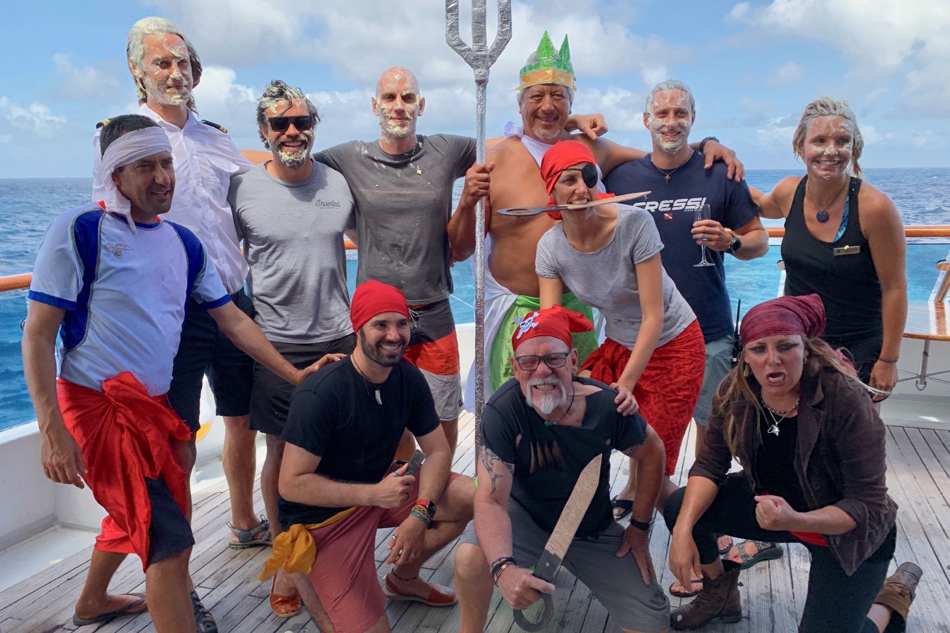 After the excitement and ceremony of crossing the equator yesterday, we woke up slow and refreshed this morning. Wanting to get outside and stretch, we wondered aft, where we found our expedition leader Jimmy White and dive master Beau Price in a session of coffee and yoga.