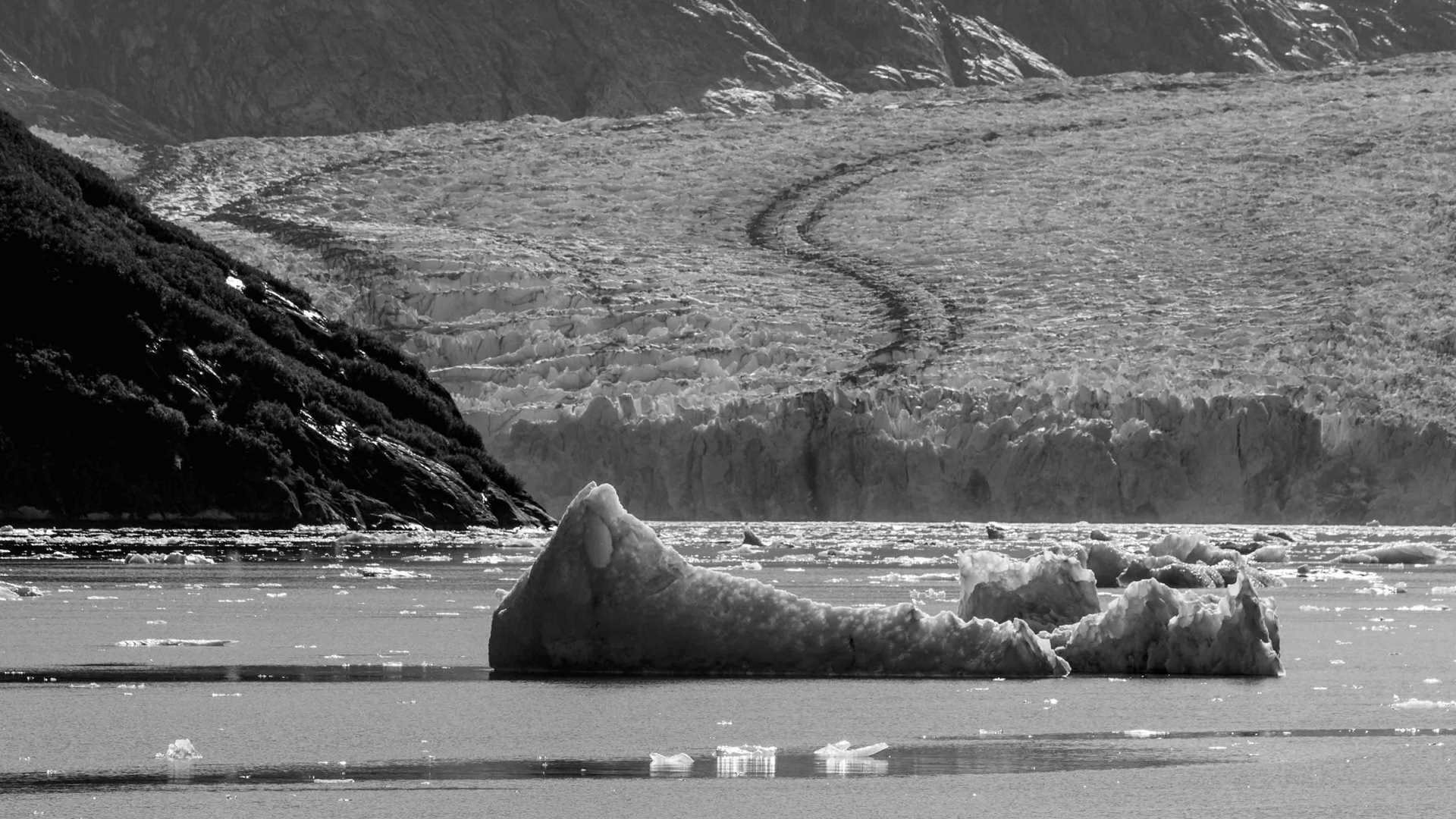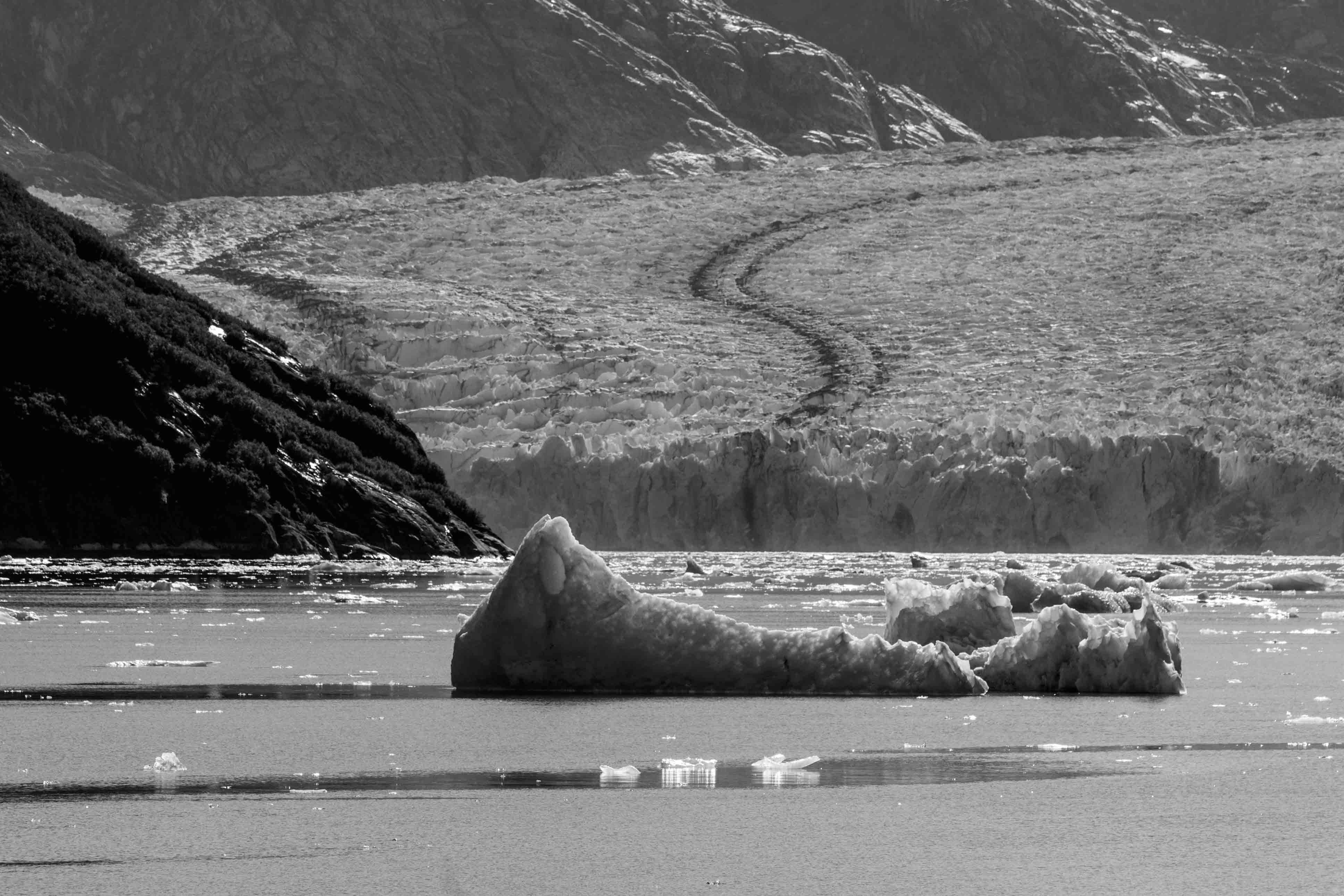 At dawn we entered Endicott Arm. Like all salty bodies in southeast Alaska, this is a fjord, but it is one of the most intense in the region. This is because Endicott, like Rudyerd Bay, cuts so far into the coast that it lies in granite and related rocks. Glaciers carve these rocks into the most beautiful forms. Huge domes towered over us; great cliffs, grooved by the passage of the glacier’s stony belly, rose hundreds of feet from the waves. Dozens of frothy falls tumbled through the trees. Mountainous horns pierced the sky and glaciers filled alpine valleys, and one, at least, touched the sea. Icebergs floated in water colored a beautiful milky jade. More and more bergs appeared until we could see the glacier in the distance. At that, we dropped boats for an intimate view of the ice. We sped by bergs inspiring notions of many a sea creature. We saw icy swans, whales or dragons. Some bergs were huge, blue and hoary, scalloped or pierced into endless sculptures. And at last we approached the glacier: Dawes Glacier flows five icy miles from the Stikine Icefield, and its face is three-quarters on a mile wide, and at least twenty stories high. And from this face we saw great chunks of ice fall, splashing up fountains of spray, roaring, and rocking our boats in vast but gentle swells.