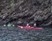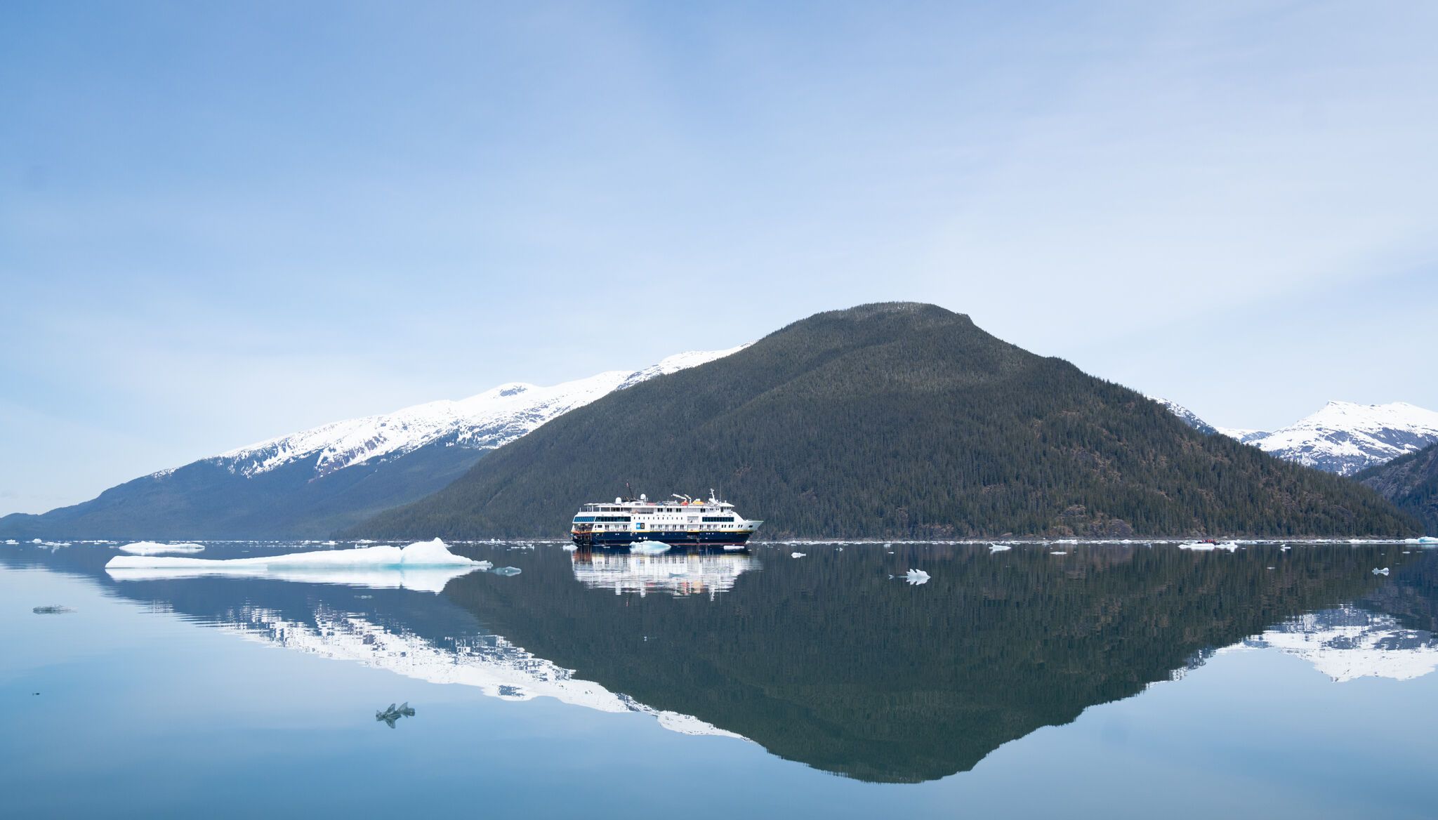 Today was an exceptional day for wildlife encounters and stunning scenery. National Geographic Venture entered Endicott Arm, a fjord full of snowcapped peaks and ice floating in the sea. We cruised on Zodiacs, maneuvering around icebergs. We enjoyed many surprises as we traveled, including a black bear foraging along the shore. We all stayed quiet while Marylou maneuvered the Zodiac as close as possible without disturbing this magnificent animal. It was sunny, and the sky was totally clear. Glassy water offered the best reflections of the ice and the mountains. Everything was peaceful and quiet as we contemplated the bear. Suddenly, Marylou turned the engine back on – she heard a blow – and we headed back to see a humpback whale swimming by the shore. It put on a show, giving us the best possible ending of a Zodiac tour that we will surely never forget.