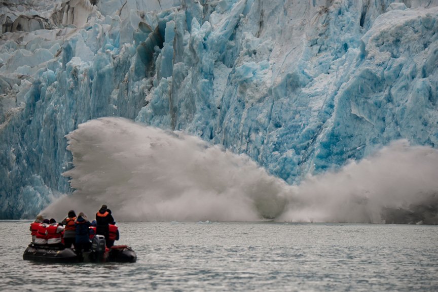 We cruised toward the glacier face in our expedition landing crafts, keeping a safe distance in case of calving ice. Suddenly a great tower of ice let loose and crashed into the water, creating a huge splash and tremendous thundering sound. Later a giant piece of ice broke off the underwater part of the glacier and dramatically surged to the surface. Smooth-patterned and deep blue, it soon became an attractive perch for a variety of gull species.