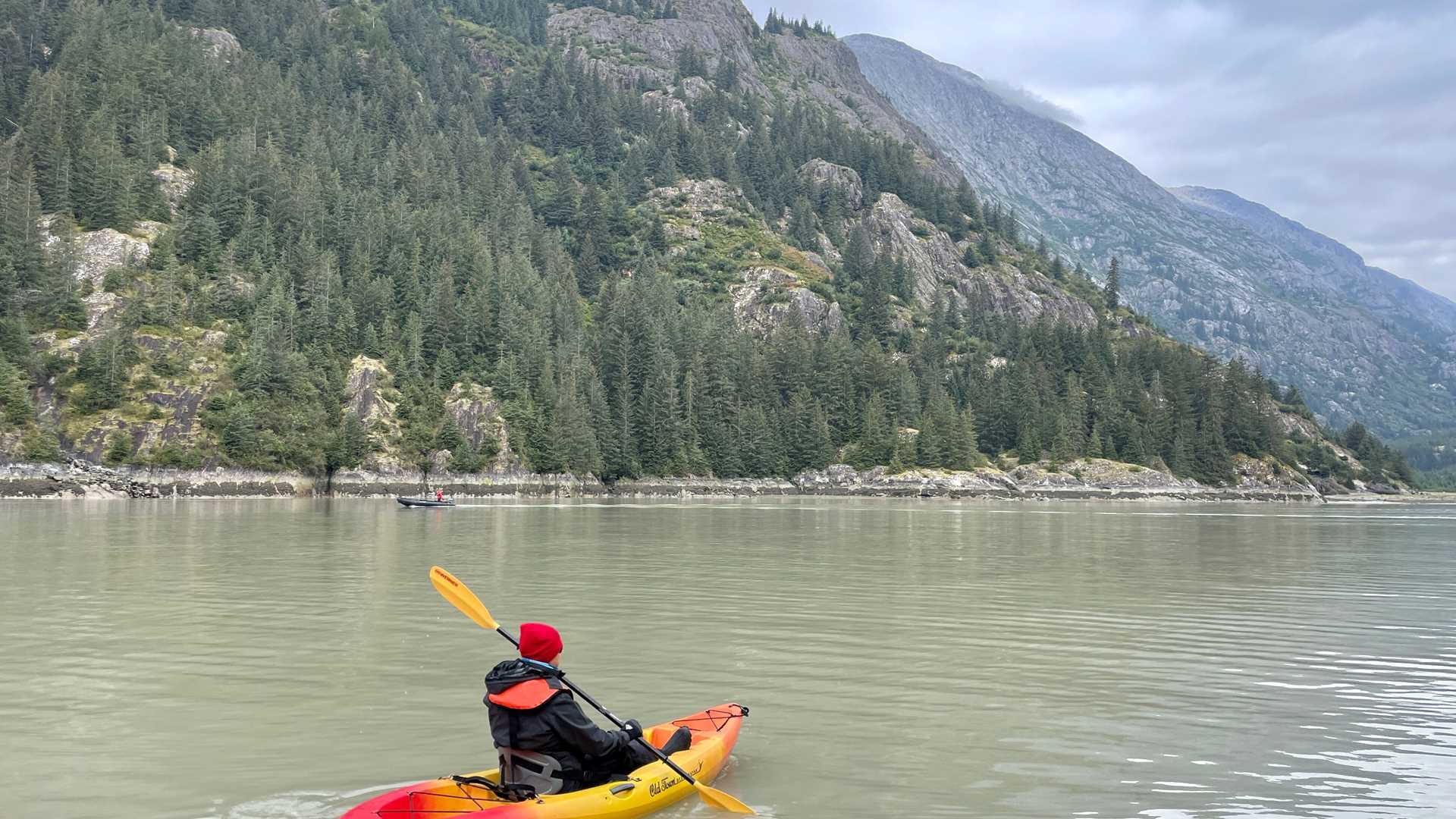 This morning we anchored in a depth of about 240 feet within Dawes Cove, a small inlet off Endicott Arm. The weather was overcast and cool, but no rain was seen during the early morning stretch class with our wellness specialist. After a hearty breakfast, several guests opted for kayaking in Dawes Cove. It was a peaceful paddle exploring multiple waterfalls along the steep glacially-carved cliff faces that rise more than 2,500 feet above the sea. After kayaking, the energy on National Geographic Sea Bird became raucous, as the crowd cheered on the thirty Polar Plungers who took the leap into 41-degree waters! It was a fantastic time for all.