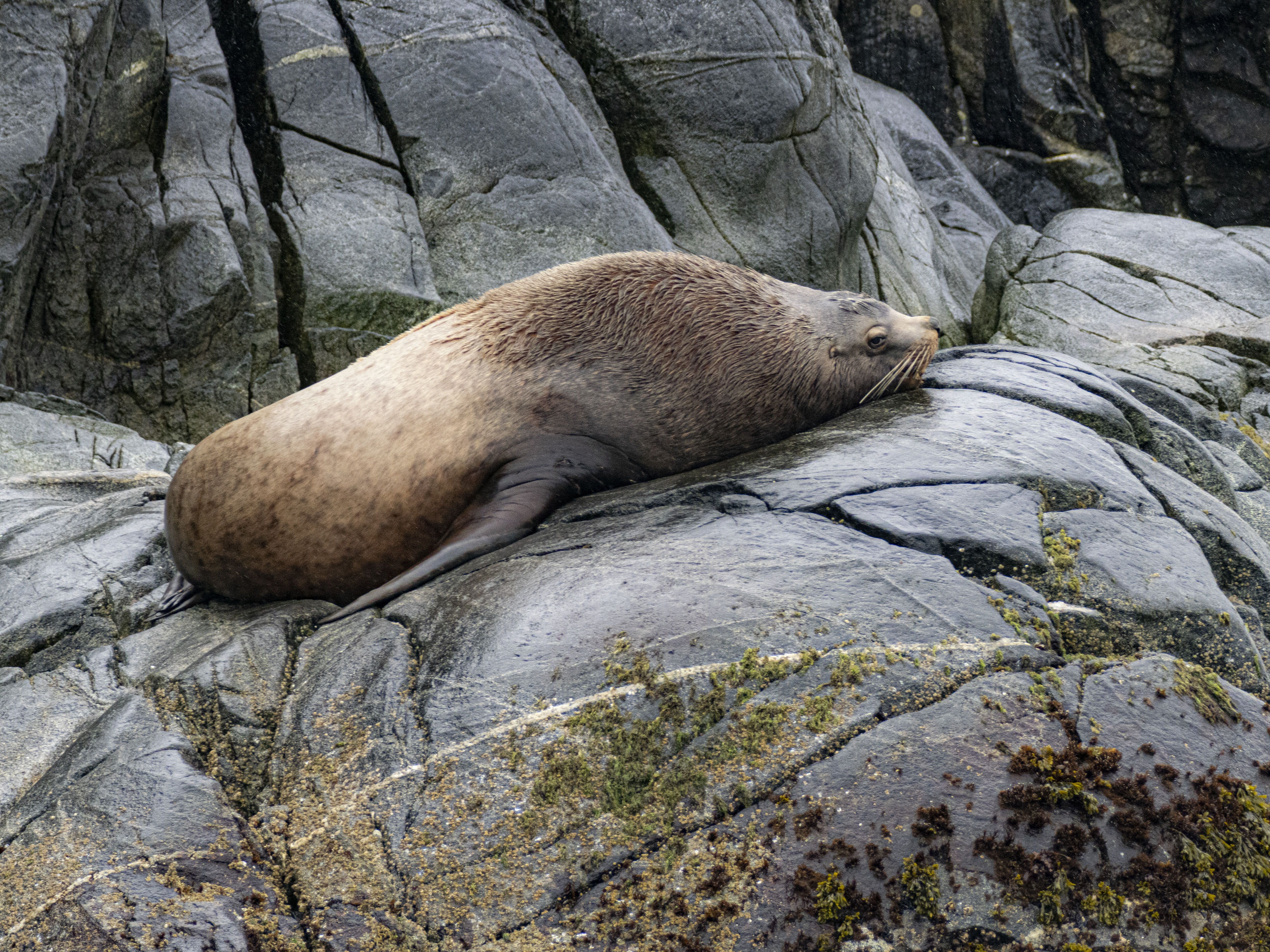 Early in the morning National Geographic Venture sailed into Holkham Bay, and made a turn into the Endicott Arm in the Tracy Arm-Fords Terror Wilderness area. We sailed up and into Fords Terror, taking in the beautiful scenery and sheer cliff walls of this part of the fjord. A black bear was spotted near a waterfall and after eating a bit on the shore, it began to climb the seemingly impossible steep cliffs with ease. After lunch National Geographic Venture was positioned with a distant view of the Dawes Glacier, and everyone set out for a Zodiac tour through the ice that had calved off the face in the past few days. We saw harbor seals on the ice at a distance, and a few swimming in the water. The weather was ever changing, and there was some pelting rain, but everyone had a great time in the midst of all the stunning wilderness.