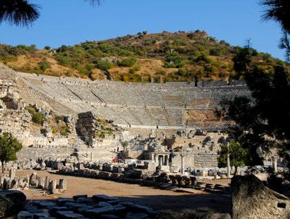 Hard to believe that this will be the last sunrise we will experience from the decks of the Sea Cloud and what a glorious dawn it was as we slipped past the small Ottoman fort at the top of Pigeon Island and made our way to the dock at Kusadasi. Our route to Ephesus took us over rolling hills of Mediterranean pine and past dark emerald green citrus orchards, through the market town of Seljuk to the Magnesia Gate, the eastern gate of ancient Ephesus, situated high on the slopes of Mt. Pion. At its height in the 1st Century A.D., Ephesus was the capital of Roman Asia with a population of 250,000 people, many of whom made fortunes from trade of exotic spices, silks, slaves, marbles, and general produce that flowed through its huge port. The city was founded in the Bronze Age by the Hittites along the banks of the Cayster River and was known as Apasas (honey bee). It grew into a significant Ionic sanctuary site dedicated to the goddess Artemisia from the 8th century B.C. onwards. Ephesus was home to one of the Seven Wonders of the Ancient World—the Artemision, the largest Greek temple ever built—three times the size of the Parthenon in Athens.