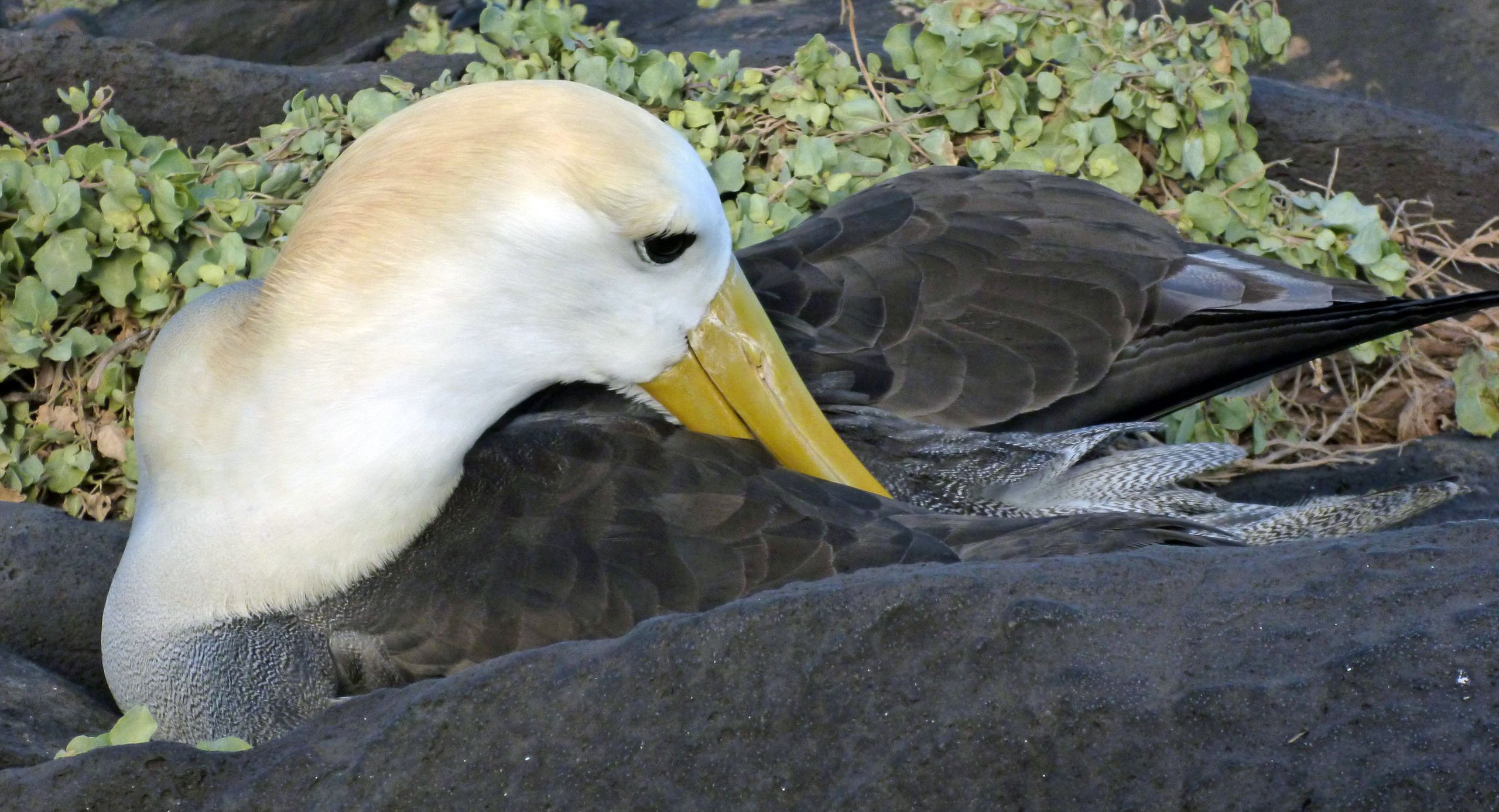 As we began our walk across the lava, we could see that erosion had converted the lava flows into boulders. The aerobic walk took us to the nesting ground of the waved albatross, one of the part-time inhabitants of this place. We were lucky enough to spot a few of them still on the island—we know that by the end of the year they will all be gone! The albatross is an oceanic bird that only comes to land to reproduce. They like to nest here due to the cliffs, which help them to take off. Being oceanic, they are big, and need the help of the wind to make it in flight.