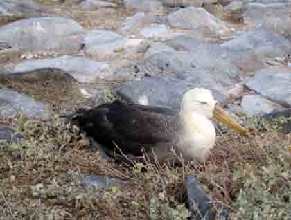 Walking inland, the vegetation changed considerably. We observed small dry trees that looked like bushes due to the lack of water. Some warbler finches and small ground finches called our attention until we finally observed a juvenile waved albatross resting under the bushes, its bill looked a little bit paler than the adults’ and the head was still covered with some fluffy feathers. It remained in that position indifferently while we tried to get some good pictures. In the air we observed two Galapagos hawks flying over our heads and landing on a rock close to us. We had a chance to observe their brown feathers open like a fan of paper and their powerful talons and bills.