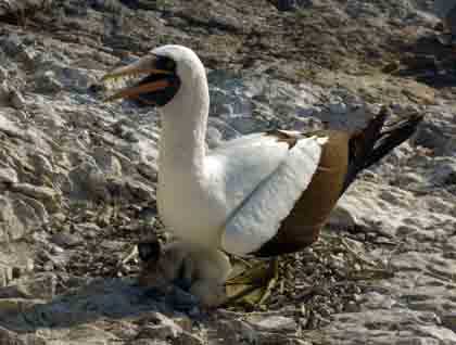 In the afternoon, the National Geographic Endeavour was repositioned in order to reach our next destination, Punta Suarez, which is located further east of Española. This is a part of the island that was uplifted from the ocean, and the contrast of abundant cliffs, boulders and flat terrain were the result of those incredible geological effects. We disembarked onto the small dock that leads to white beaches, where a large number of young pups swam freely under the watchful eye of a big male sea lion. At almost every step we took there was a lava lizard or a marine iguana to avoid; due to their dark coloration they blend perfectly well against the black rocks of the shoreline. Walking inland, we observed the abandoned nesting grounds of the endemic waved albatrosses; we found remains of broken eggs left behind many months ago when the new hatches appeared, and subsequently abandoned Española to come back after four or five years as adults birds. Because of the high temperatures during the first months, albatross migrate away from Galapagos, but we held out hope that a few might still remain under the bushes and trees. Our efforts were rewarded, and we finally found a couple flying directly over us, as well as one last juvenile that still was not ready to leave Galapagos, because its plumage was covered with fluffy feathers. This magnificent bird was flapping its wings, and probably in few more days will start an incredible journey that takes many years along the southern part of South America.
