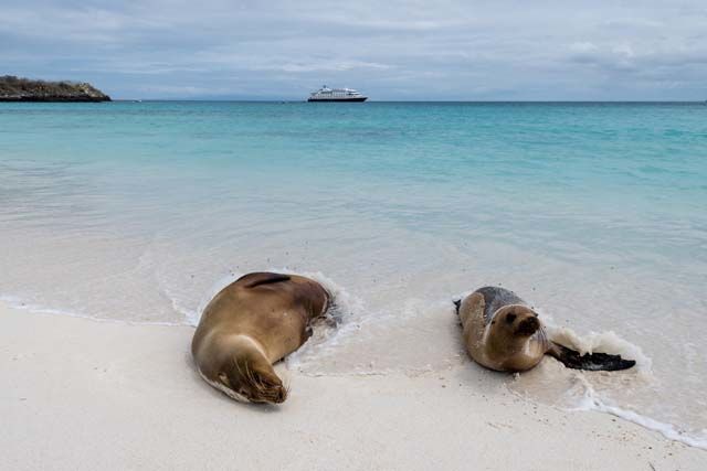 and on its white, coralline sandy beach lie restful Galápagos sea lions. This