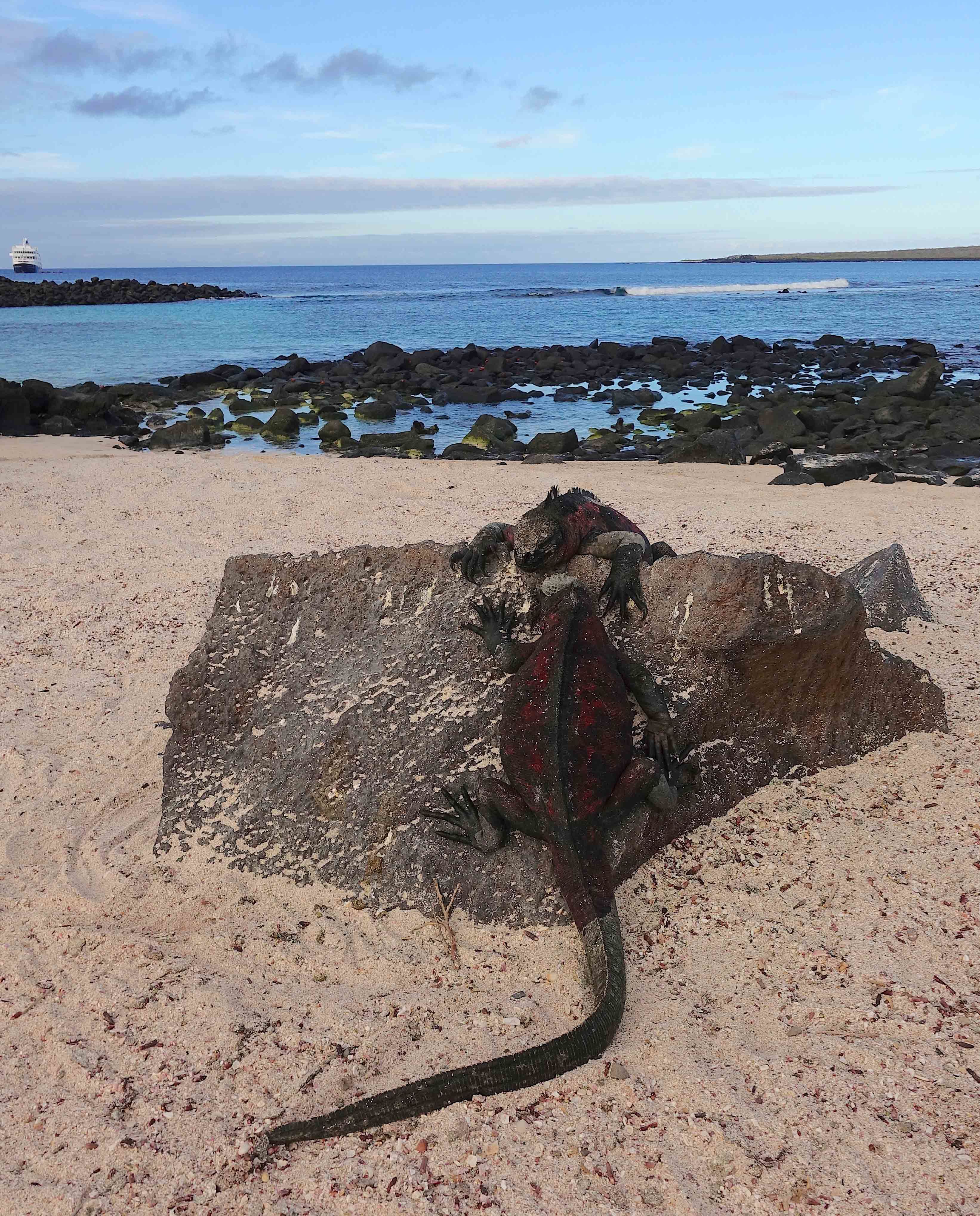 Our first complete day of exploration leaves us with a sense of awe at Española Island. One of our older islands, it appears to be arid and devoid of life at a distance, however, this is far from the truth. The surrounding ocean is highly productive this time of year, allowing for an abundance of life on the island. Galapagos sea lions swim among us as we snorkel along the coast in the morning. On the fine white sand Gardner Bay beach, we have young Galapagos hawks soaring overhead with Española mockingbird’s fliting between us. We leave the turquoise waters behind as we navigate into the afternoon and Punta Suarez. A late afternoon walk allows us to encounter Nazca boobies, red-billed tropicbirds, marine iguanas, sea lions, blue-footed boobies, and the majestic waved albatross. The late glow of the sunset falls upon an albatross feeding its young, with the avian species returning to their nesting areas, a wonderful end to this day.
