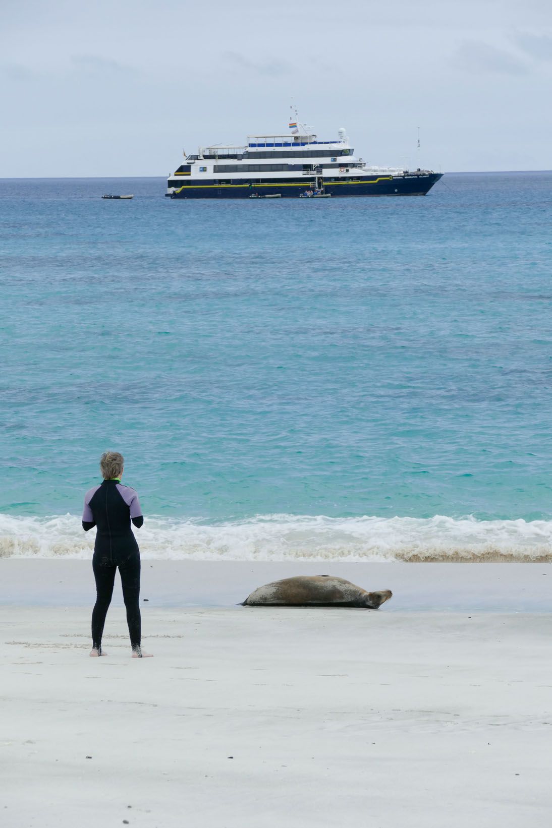 After a thorough briefing about snorkeling procedures, everyone interested tried the equipment either from the beach (great way to get going if it’s been a while, or perhaps one’s first try) or from the Zodiacs into deep water – and we went snorkeling! The underwater world of Galapagos is spectacular because one never really knows what to expect (fish, mammal or reptile)! As a group, we saw all!