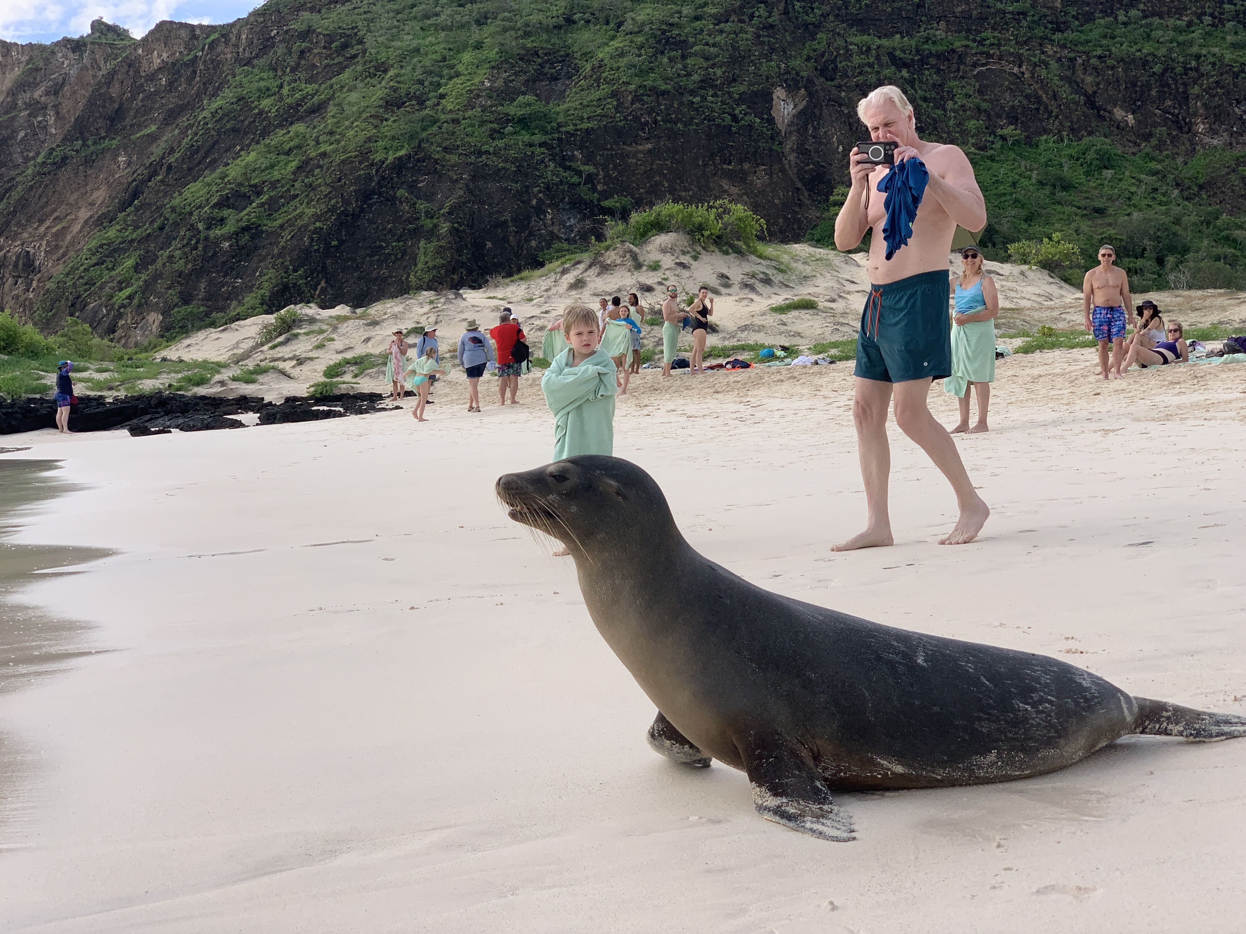 Espanola Island has one of the most beautiful bays of the archipelago, Gardner Bay. This morning, we enjoyed the perfect weather and water conditions here, from kayaking along the coastline to snorkeling in crystal-clear waters. Some preferred to just swim or relax at the white coralline beach of Gardner Bay and were happy to share it with a colony of sleepy Galapagos sea lions.