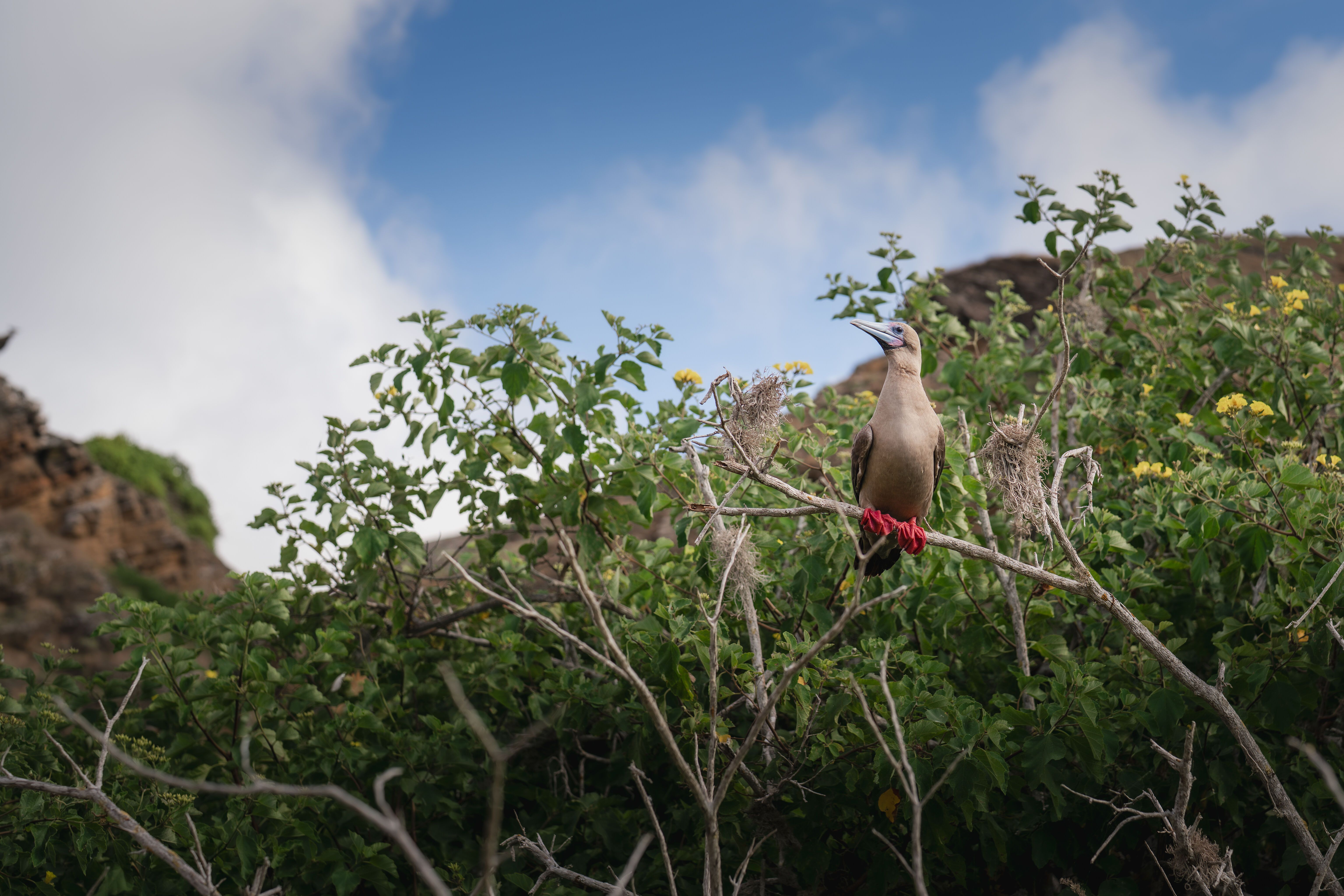 Sadly, our expedition aboard National Geographic Gemini is nearing its end. Our day began with a hike at the base of towering cliffs. A steep ascent led us to a plateau of a palo santo forest, sparse and otherworldly. Almost immediately, we were surrounded by red-footed boobies nesting in low trees and Nazca boobies on the ground. A highlight was spotting a short-eared owl perched silently among a lava crevice, camouflaged and hunting storm petrels. The calls of frigatebirds rang in the air, with their inflated red pouches on full display in a mating show. After our hike we enjoyed water activities, such as kayaking along the cliffs and snorkeling. In the late afternoon, we landed on the coral sand beach of Darwin Bay. Guests enjoyed a relaxing stroll along the shoreline bordered by mangroves and nesting bird colonies. The presence of swallow-tailed gulls, lava herons, and marine iguanas provided excellent photo opportunities.