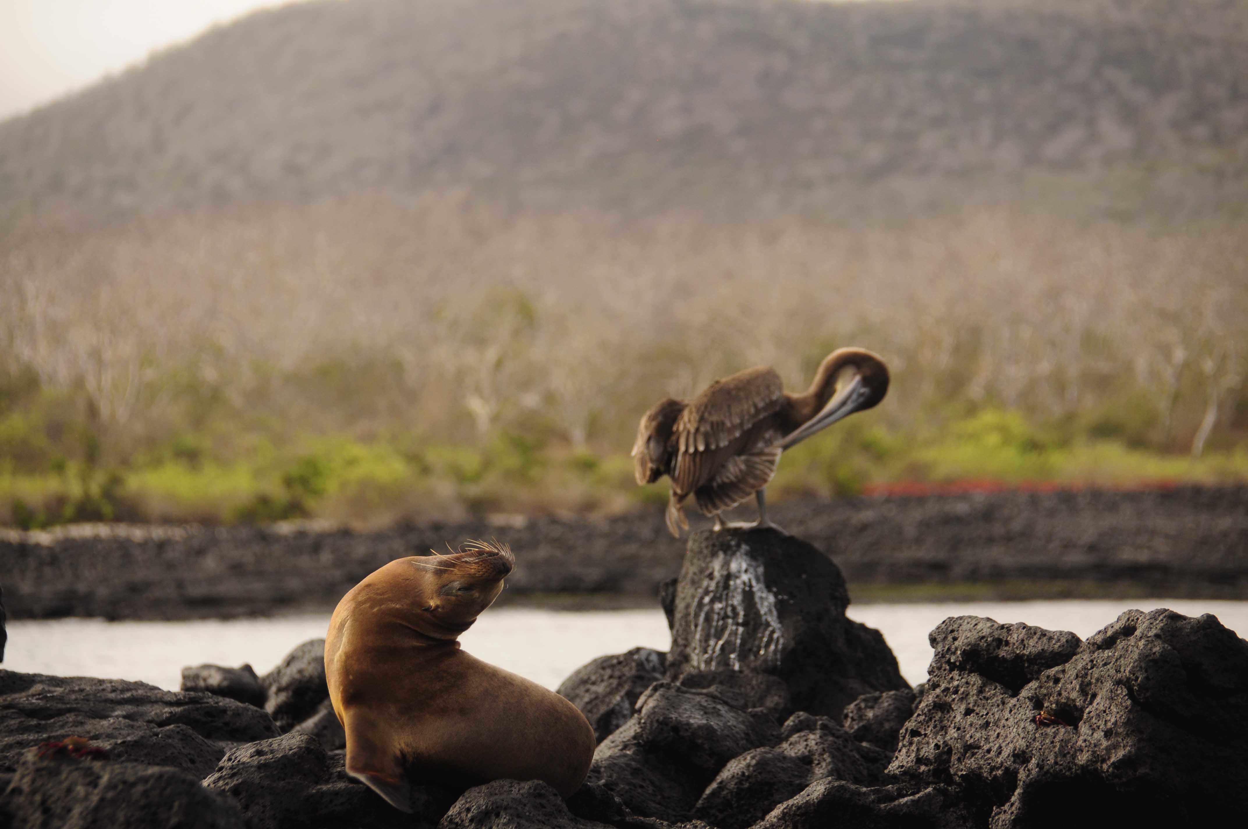 Today we woke up at Gardner Bay in Española Island. After a delicious breakfast, some guests disembarked for deep water snorkeling along the shore of Gardner Islet, while other guests went to visit Gardner Beach. Sea lions welcomed us at the beach and guests had a great time taking photos of these animals peacefully basking in the sand. In the afternoon, we disembarked to explore Punta Suarez. Here, we could find one of the most beautiful sea birds in Galapagos, the waved albatross. It’s the end of the mating season for these birds, and we observed a few couples in their final days on Española before they fly down to the coast of Peru to find food. We also found one of the largest nesting grounds of Nazca boobies, where we observed males bringing tiny rocks to females to catch their attention for mating. We ended our day with our traditional recap of the day onboard the National Geographic Endeavour II.