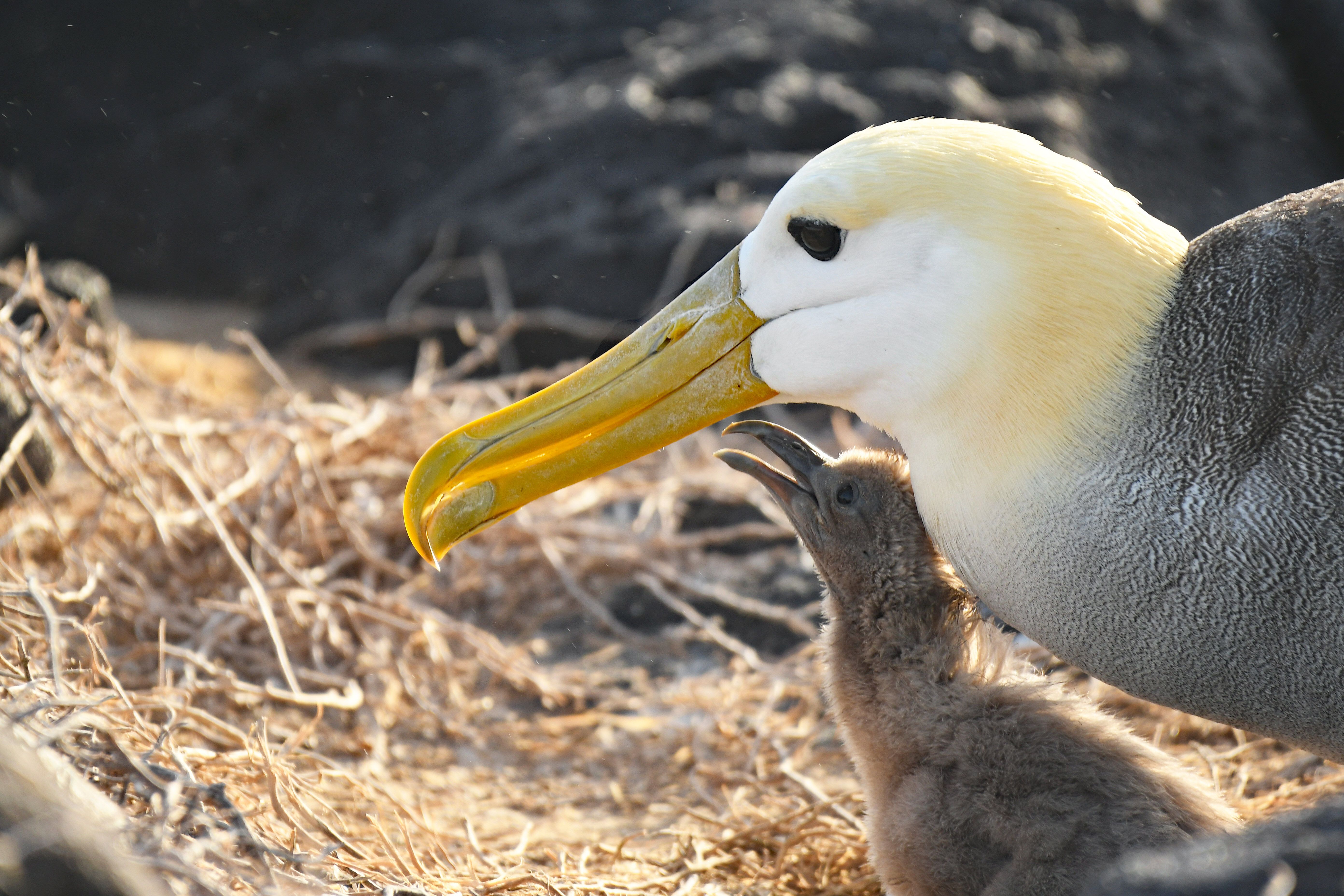 In the afternoon we moved to Punta Suarez. This site is considered the jewel of the crown, because as soon as you walk a few yards, you see many varieties of animals with every single step you take. We had a glorious time exploring that amazing place. We found albatrosses mating, dancing, and feeding their babies. We encountered blue-footed boobies nesting just a foot from our trail, hawks hovering in the air, Nazca boobies nesting, marine iguanas basking, and many finches getting seeds to eat. The sunset was spectacular — a great finale for such an amazing day in this paradise.