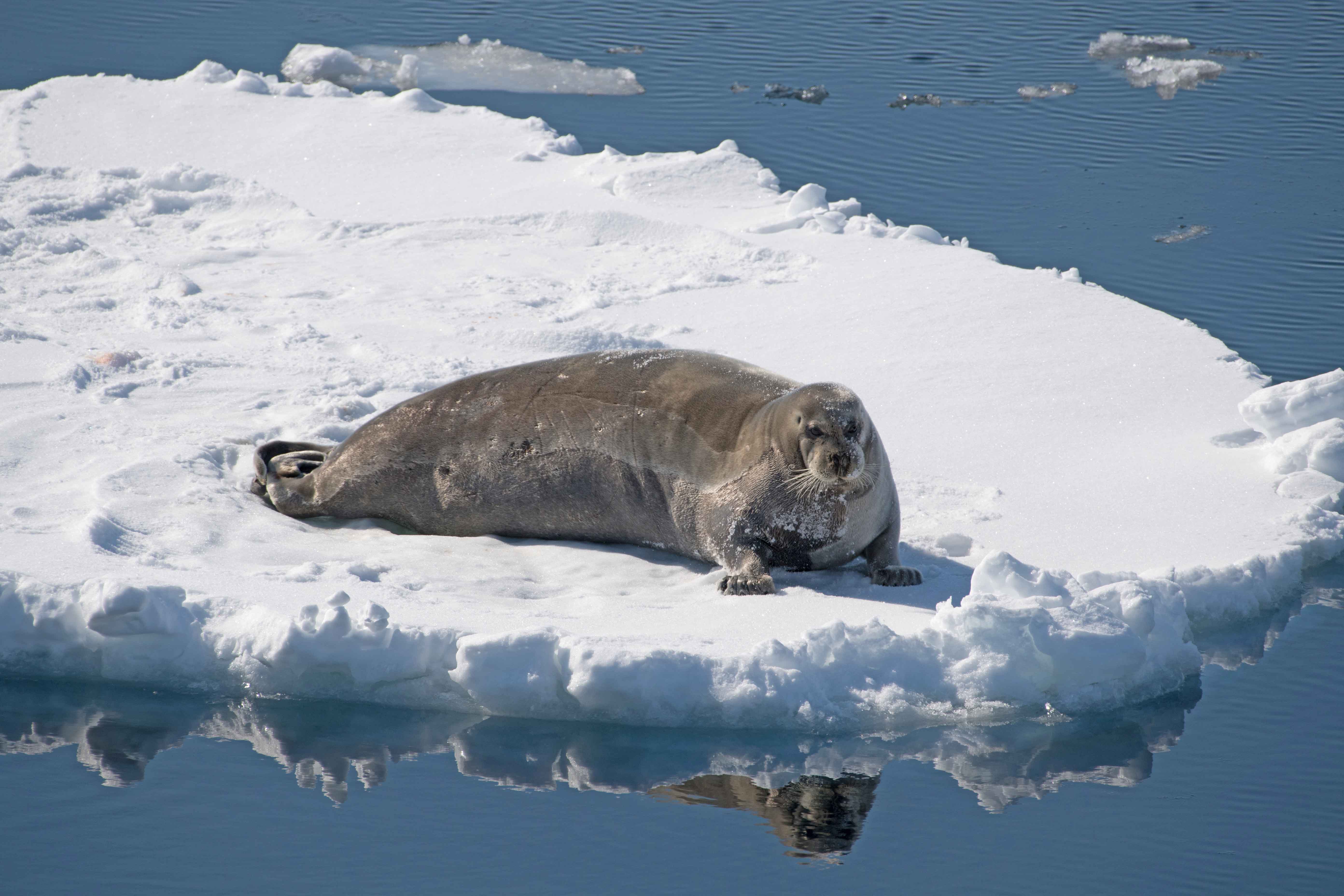 Our goal today was to find a polar bear, not easy when you consider the vastness of the ice and the limitations of traversing it in a ship. But our ship’s officers are not easily deterred, and they were as determined as they were skilled. Often we would pass a piece of ice with the fresh footprints of our prize, but the hours went by, and still no bear. At least there was beauty all around us, and none could deny the hypnotic effect of the ice. As is often the case, our guests come for the wildlife, and fall in love with the ice. The searching did bring another prize, a bearded seal that let us venture very close indeed. Our Captain showed us that even with a four hundred foot vessel, he could stealthily approach a seal lying on a piece of drift ice without ever disturbing the seal. The mark of a good naturalist. We watched for a while and then, as carefully as when we approached, our ship backed away, leaving the seal undisturbed.