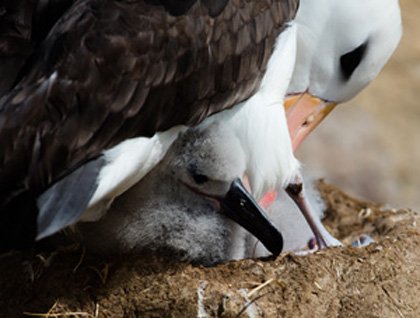 As we approached the colony area, the wind was noticeably stronger and a slight drizzle started falling from the overcast sky. This, however, did not dampen our enthusiasm for what awaited our senses, and our cameras. Imperial shags, rockhopper penguins and black-browed albatross seemed to be everywhere, blended together into a constant whirl of activity! All three species had older chicks either on nests or in crèches. Many begged for food from a parent, or contently waited for a parent to return with food. One of the real highlights of the morning was watching these tough little penguins leaping into the huge surf at the base of the cliffs. How do they survive?