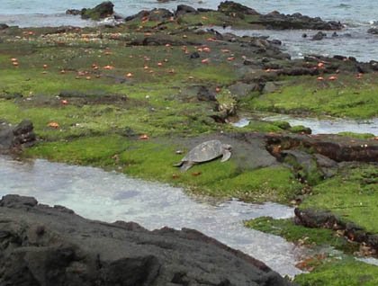 Then we arrived at the shallows where some sea turtles swam peacefully while others warmed their bodies on the rocks, which appeared to be completely covered in green algae. This tranquility was interrupted by a noisy sea lion barking constantly, warning other males not come to this place. Finally we reached the territory of the flightless cormorants. Many were opening their stumpy wings and drying out their wet bodies after a successful morning of fishing for a great variety of fish and sea creatures.