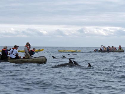 After a long nocturnal navigation, the National Geographic Endeavour reached the western side of the Galapagos Islands. Lying next to each other are Fernandina and Isabela Islands, the youngest of the archipelago. The scenery has already dramatically changed since yesterday, with the outline of several shield volcanoes surrounding us. After breakfast we landed at Punta Espinosa, on the northeastern coast of Fernandina. Everywhere we look the landscape is black and inhospitable: large flows of recent basalt cover much of this island. However, life finds its way into newly formed land. After a short while we realize that there are creatures here after all, all of which are rather unique: snakes and lava lizards, Galapagos hawks and herons. But they were all outnumbered by “flows” of endemic marine iguanas, which despite their mean looks are totally defenseless and oblivious to our presence. Some vegetation is present in the area, with red and white mangroves forming little forests, as well as the endemic lava cactus growing in small cracks on the lavas. The circuit around Punta Espinosa brings us to some small groups of flightless cormorants. It is their breeding season right now so we had a unique opportunity to see them courting, dancing and building their nests on the shore. After the walk we returned back to the ship. Next in our schedule was a snorkeling opportunity along the coast nearby. The surrounding waters are shallow and full of nutrients, and this attracts numbers of Pacific green sea turtles to forage on the local seaweed. Our fearless snorkelers were at times accompanied by some flightless cormorants which were hunting the fish or eel.