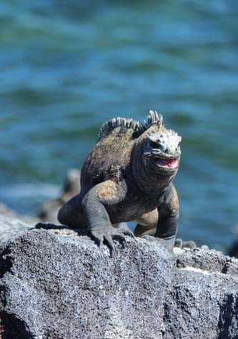 As we stood out on deck, taking in this spectacular backdrop, we were treated to sightings of many species of sea birds, such as boobies and Galapagos shearwaters. To top it off, our deck officers sighted a large school of common dolphin, Delphinus delphis, off in the distance. We changed direction and spent some time admiring the acrobatic antics of these small and attractive marine mammals, many of which were accompanied by tiny calves. We eventually took up our course again and dropped anchor off the coast on Punta Espinoza, Fernandina – the youngest and most pristine island in the archipelago. Our hikes over the strangely-textured lava flows led us through mangroves, past spiky patches of lava cactus and tidepools home to Galapagos sea lion pups, and through dense groups of the largest marine iguana population in Galapagos, many of which were displaying aggressive territorial behavior as they come into their breeding season.