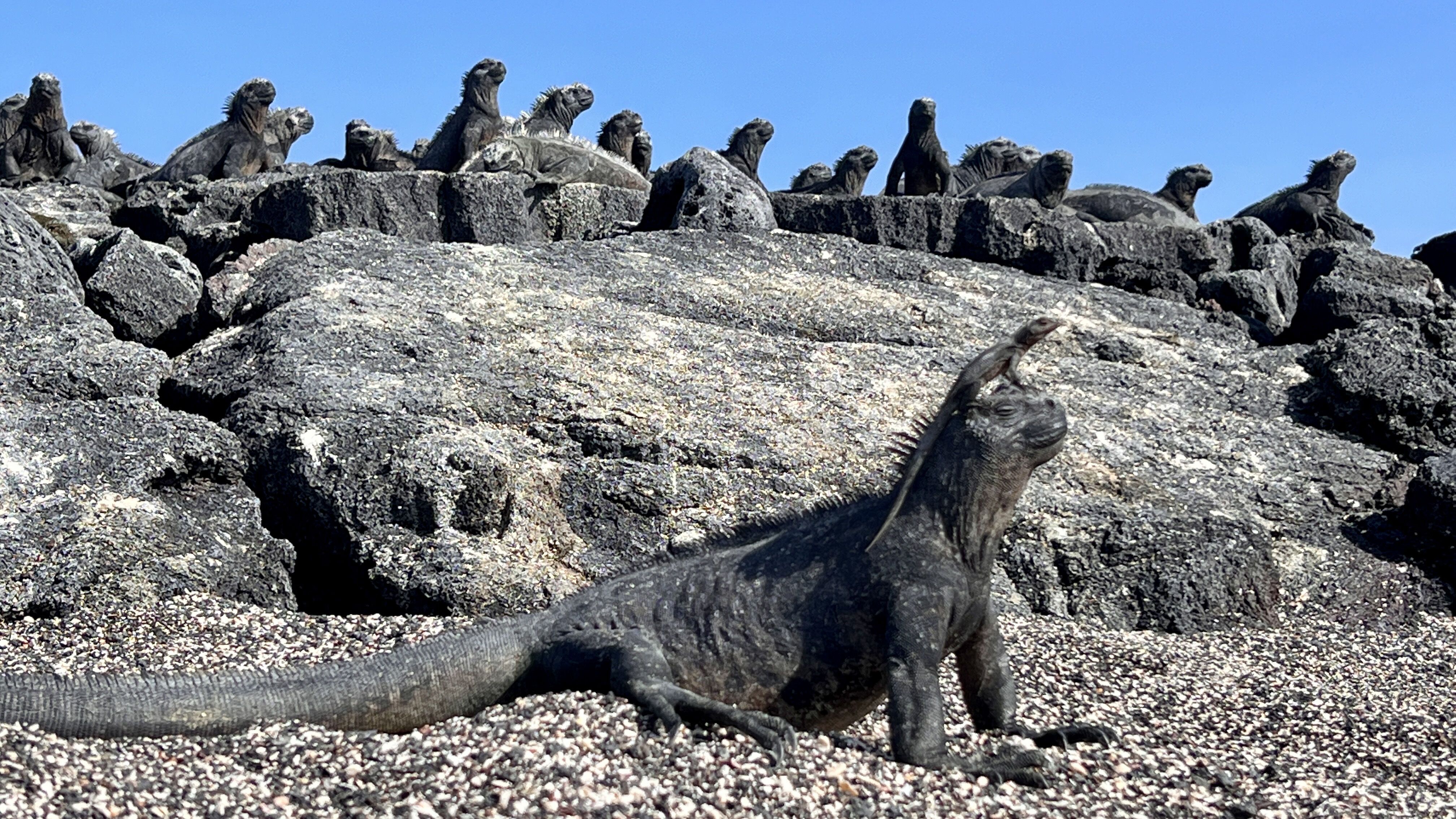 The early morning outing to Punta Espinoza is always one of the highlights of this expedition. The site is such a pristine paradise in the middle of the Pacific Ocean. It is interesting and full of life. When we visit, we are very careful where we step. Marine iguanas bask in the sun to thermoregulate their body heat so they can survive in this tropical environment.