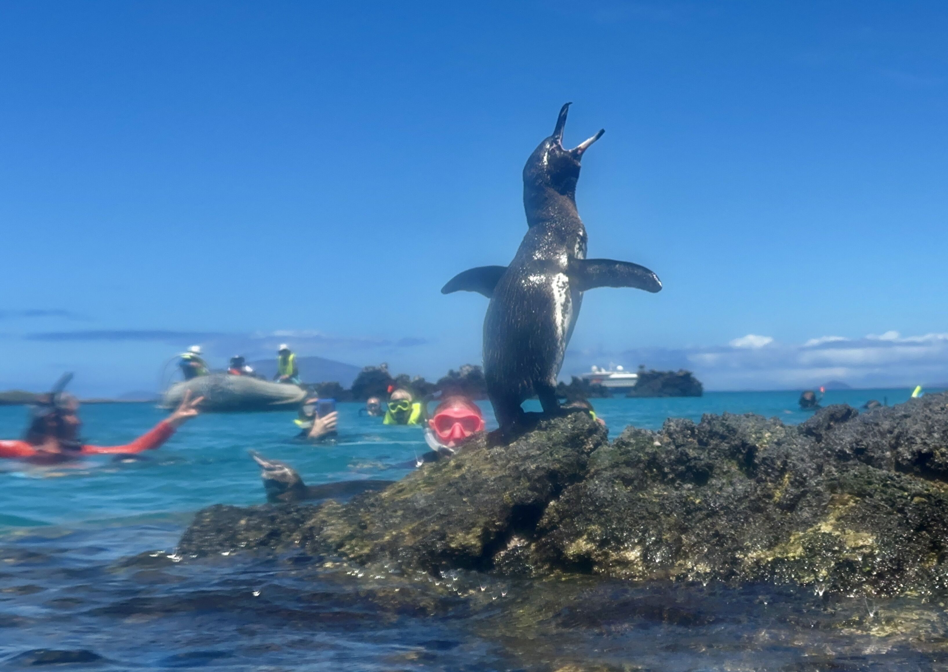 We started the morning with a walk along the coast of Fernandina Island. We were surrounded by marine iguanas and baby sea lions. After the walk we headed to the snorkeling area, where we were submerged in crystal-clear waters with marine iguanas, sea turtles, flightless cormorants, and Galápagos penguins. We also had an amazing encounter with a hawk hunting marine iguanas right in front of us!