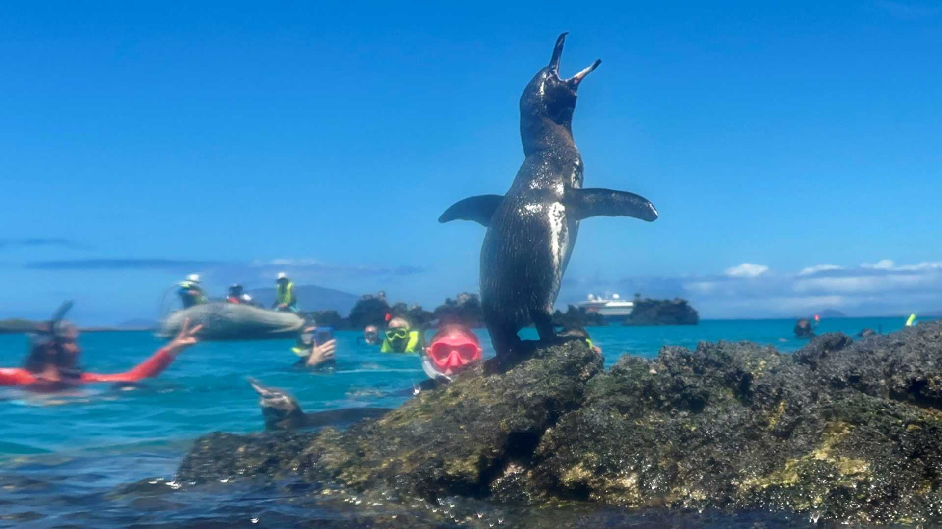 We started the morning with a walk along the coast of Fernandina Island. We were surrounded by marine iguanas and baby sea lions. After the walk we headed to the snorkeling area, where we were submerged in crystal-clear waters with marine iguanas, sea turtles, flightless cormorants, and Galápagos penguins. We also had an amazing encounter with a hawk hunting marine iguanas right in front of us!