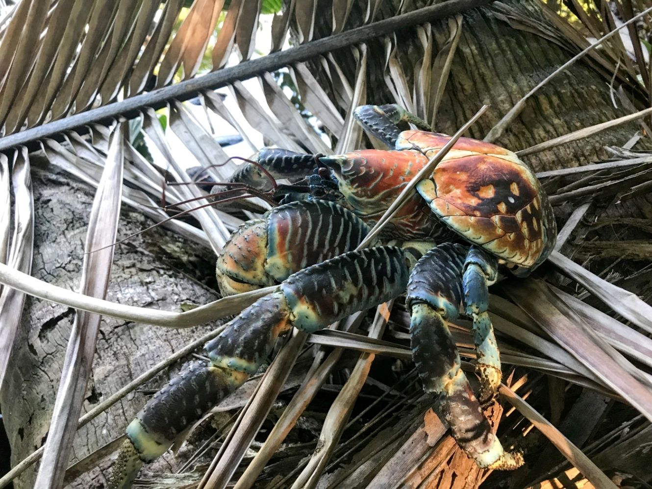 We made a landing soon after lunch onto the exposed reef flat, and then spent a couple hours or so exploring this densely vegetated island with an amazing, hard-packed coral rubble beach all around the outer edge. Some interesting sea turtle tracks were noted right near the landing, showing us that this must be an important breeding site for these beautiful creatures (at least one green sea turtle was seen earlier by some of the snorkelers). Those who went ashore this afternoon were able to walk on the beach and meander through the narrow band of tournefortia bushes that seemed almost as though they had been planted for someone’s pleasure. Most of the island is covered with coconut palms, including both mature trees and countless thousands of sprouted coconuts that have filled in most of the gaps between the trees. It was actually difficult walking over the coconuts that nearly covered the ground in some places. Inside the dense forest, we were able to view many white terns and black noddy terns perched or nesting overhead in the cordia and pisonia trees, as well as lots of tiny skinks crawling around the leaf litter. However, the most exciting creatures encountered onshore were the immense and somewhat creepy coconut crabs. These impressive beasts are the largest terrestrial arthropods on earth. They can tear open coconuts with their huge pincers! Many of us also enjoyed a walk/wade in the shallow reef water where several young black-tipped reef sharks, finger-lipped mullet, and a peppered moray eel were spotted in the large, open tide pools.