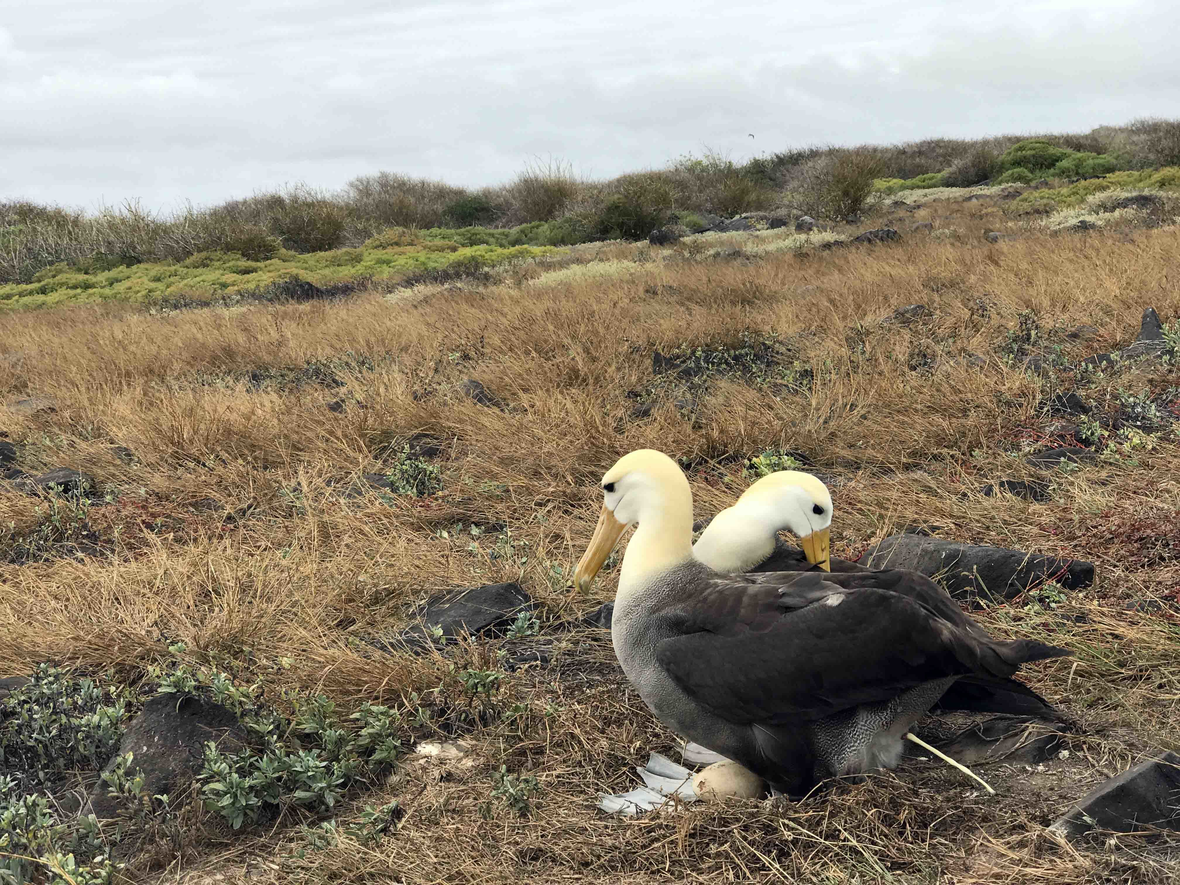 During the walk, we saw at least seven pairs of greater flamingoes nesting by the shore of the brackish water lagoon. Several flamingoes were also feeding on brine shrimp, their bright pink color in striking contrast with the surrounding lava flows. By this lagoon we also encountered white-cheeked pintail ducks swimming and feeding on invertebrates. One of the highlights this morning was to observe several pairs of blue-footed boobies engaging in their courtship ritual by the small cliffs along the beach.