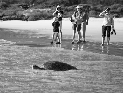 Our firs outing was in Punta Cormorant. Early risers joined us for a naturalist walk at 6:30 in the morning. The first light of the day was captured by our cameras while sea turtles were struggling in the waves close to shore trying to mate. The white sand beach was also colored by the bright color of the Sally lightfoot crabs and shorebirds were running along the beach trying to pick up small crustaceans.