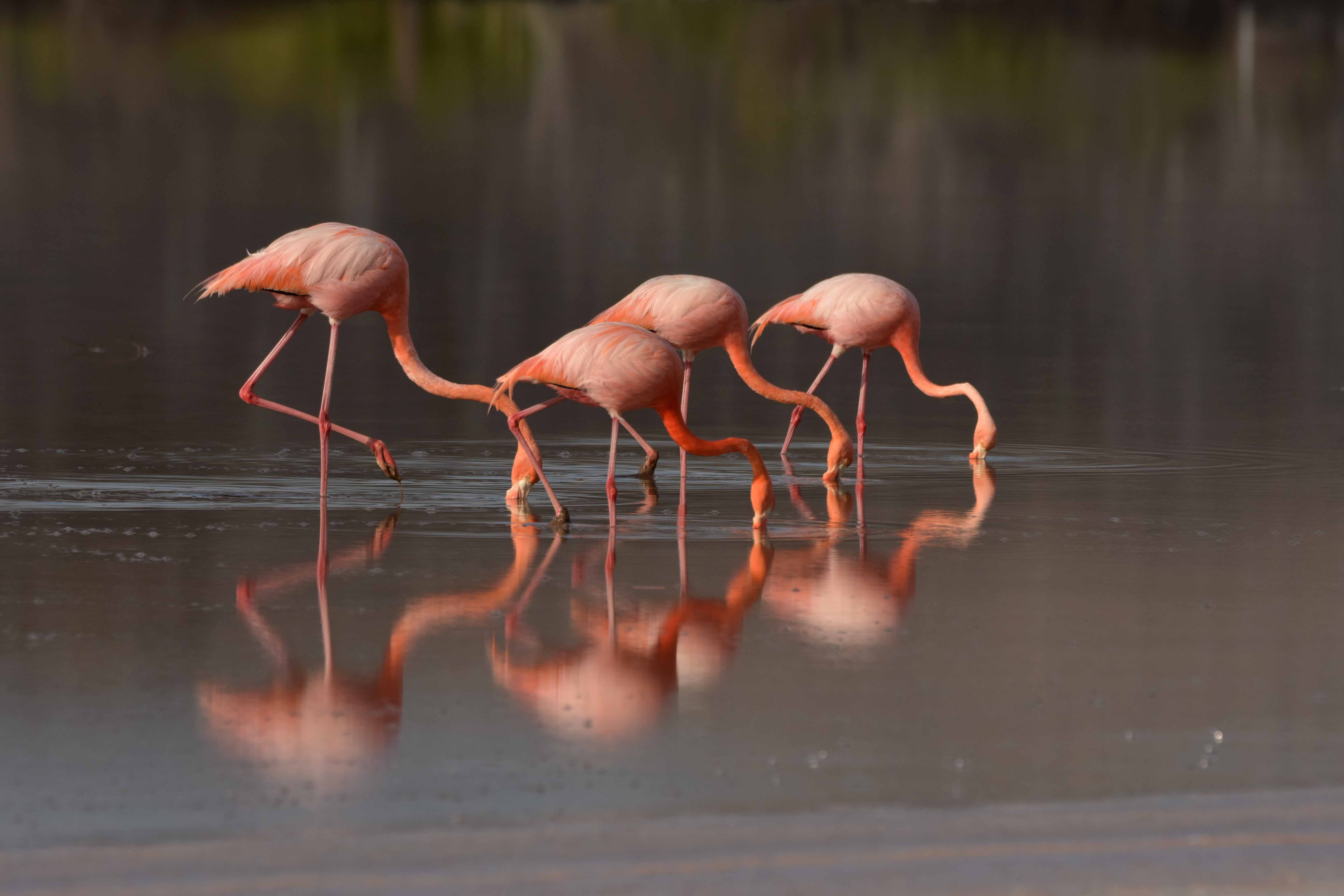 We are beginning our week with a lot of energy and our guests are very enthusiastic about exploring and learning about these enchanted islands. Today we are at Floreana, a very historical and legendary place in Galapagos, known as the island of mysteries and tragedies. Ecuador claimed the islands in 1832, and Floreana was the site of their first efforts to build a population in the archipelago. Today we are visiting three spots: Cormorant Point, Champion islet and Post office bay, in that order. So we landed early at 6:30 am, when the sun light is best for photography, and many of the sea creatures are more active. The beach where we landed has some sea lions and sea birds, the sand is greenish because of the large amount of olivine, a glass found in basalt formations. We found an adult blue-footed booby feeding its chick, the sunlight was perfect on them, and the blue feet contrasted with the green color of the sand. A magical scene! Then we walked behind the beach to a big, brackish water lagoon. There we found few greater flamingos feeding on the very nutritious ooze. These birds are very pink in Galapagos due to the amount of artemia salina, a type of shrimp rich in carotene. The morning was fabulous with a lot of surprises, including many land birds everywhere, such as finches, yellow warblers, and flycatchers.