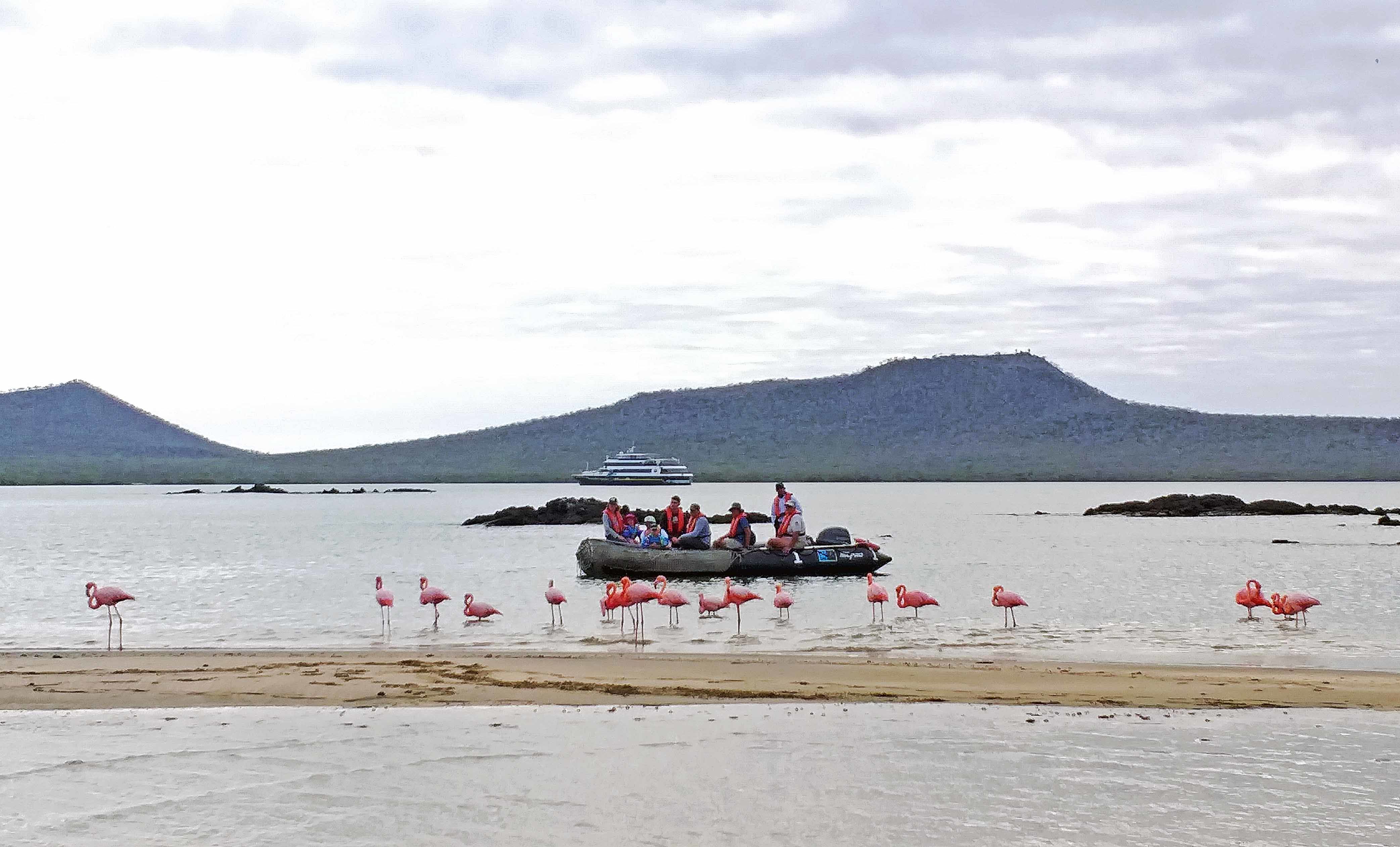 In the afternoon, we moved a close distance to Post Office Bay, a legendary place where the first man lived in the Galapagos from 1807 to 1809. Once Ecuador became a country, it claimed the islands in 1832, and since then many other people have tried to colonize the Galapagos. We disembarked on a green beach made of olivine and seashells. The shoreline here was filled with diamond stingrays. Then we walked behind the beach to learn about the first mailing system of South America, established in 1790. After mailing our post cards and learning about the island’s human history, we explored the bay; some of us on kayaks, others on paddleboards or Zodiacs. We rode in search of turtles, rays, and seabirds. The frosting on the cake for such a great day was a flock of flamingoes basking on a very small beach which separate the bay. That encounter was so close, and we loved every moment of it!