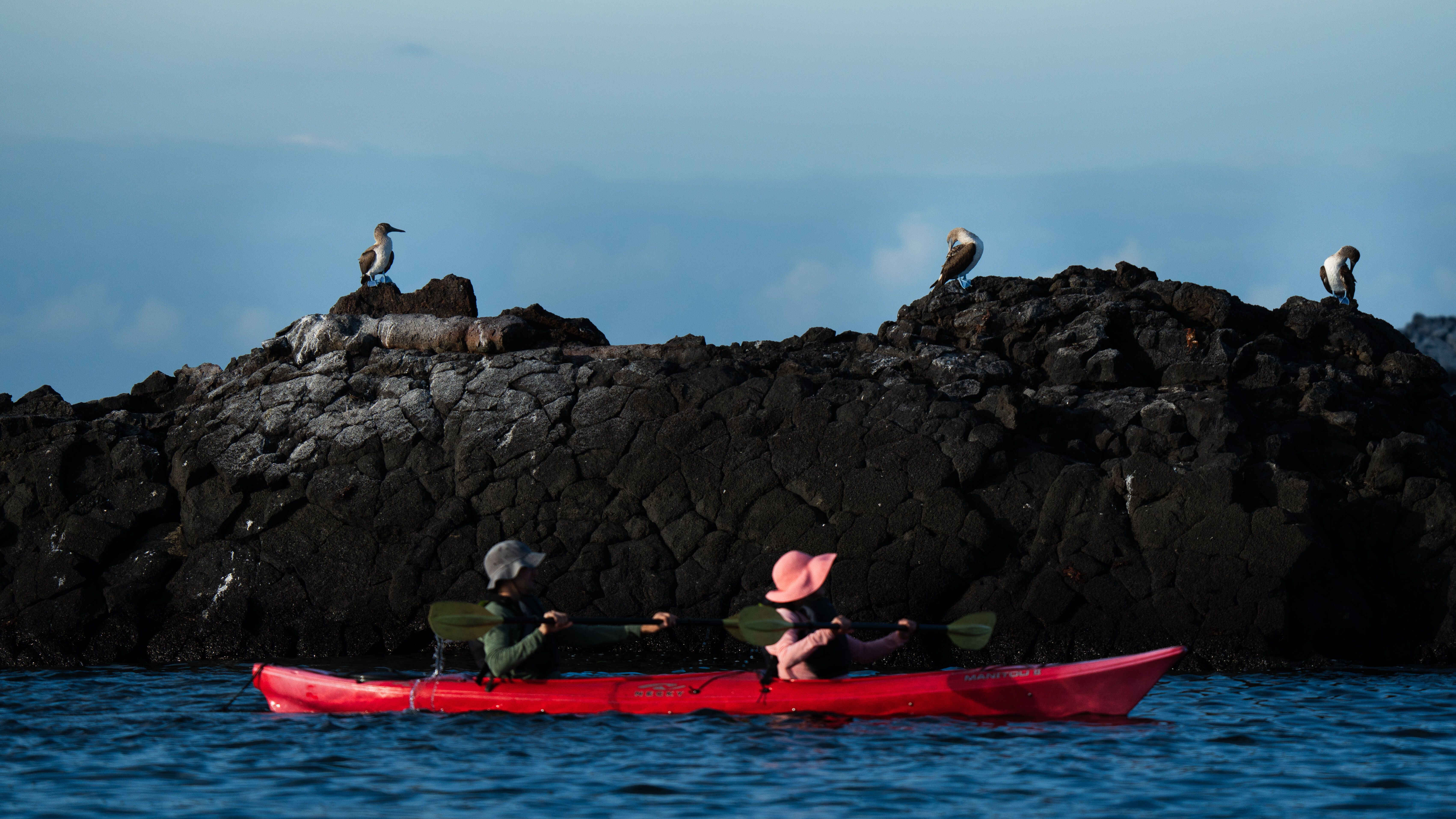 Sadly, our expedition aboard National Geographic Gemini is nearing its end. Our day began with a hike at the base of towering cliffs. A steep ascent led us to a plateau of a palo santo forest, sparse and otherworldly. Almost immediately, we were surrounded by red-footed boobies nesting in low trees and Nazca boobies on the ground. A highlight was spotting a short-eared owl perched silently among a lava crevice, camouflaged and hunting storm petrels. The calls of frigatebirds rang in the air, with their inflated red pouches on full display in a mating show. After our hike we enjoyed water activities, such as kayaking along the cliffs and snorkeling. In the late afternoon, we landed on the coral sand beach of Darwin Bay. Guests enjoyed a relaxing stroll along the shoreline bordered by mangroves and nesting bird colonies. The presence of swallow-tailed gulls, lava herons, and marine iguanas provided excellent photo opportunities.