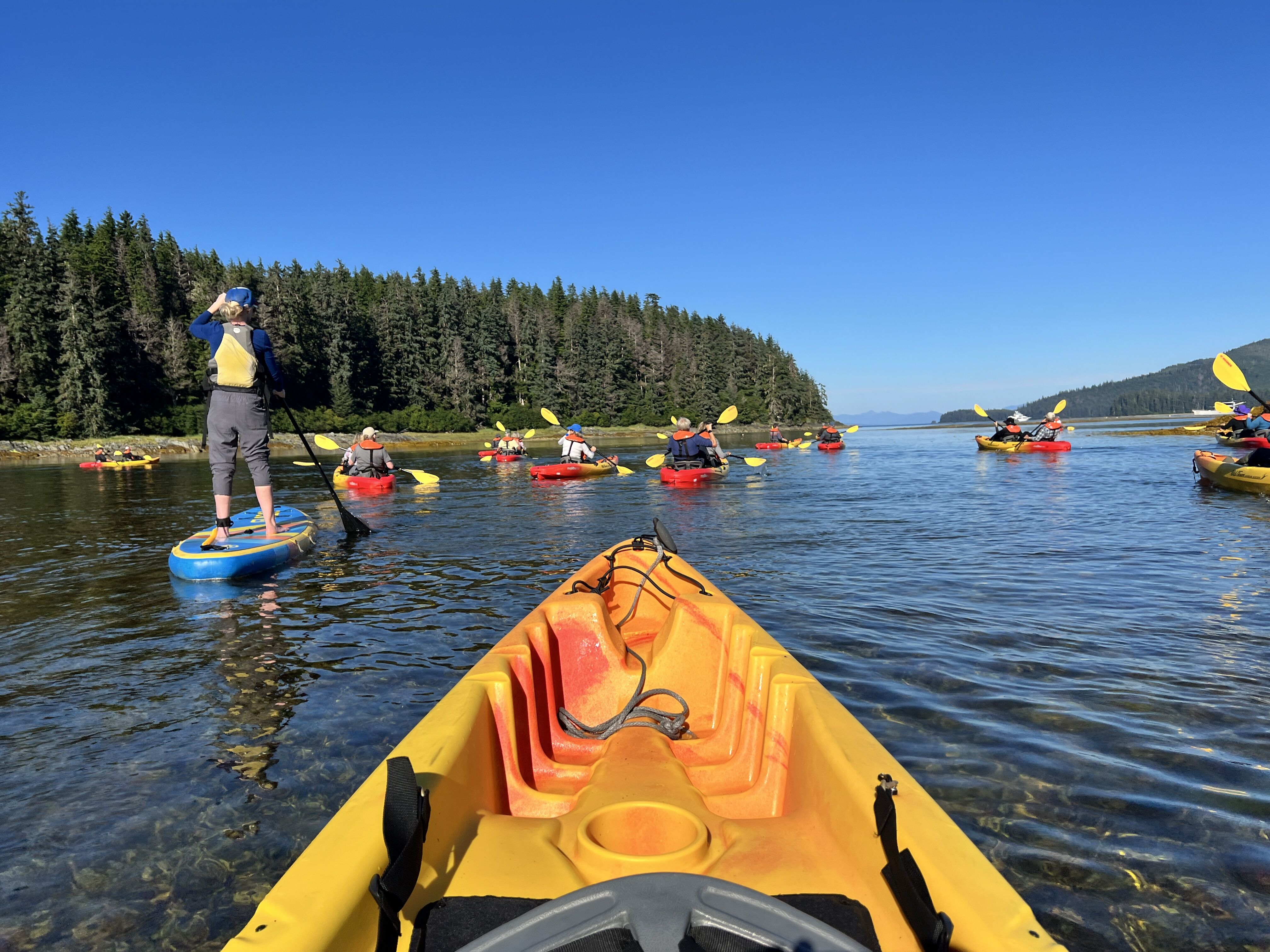We returned to National Geographic Islander II for breakfast. In the middle of breakfast, we were interrupted by a humpback whale and her calf swimming close by, so we all went outside to observe these magnificent creatures.