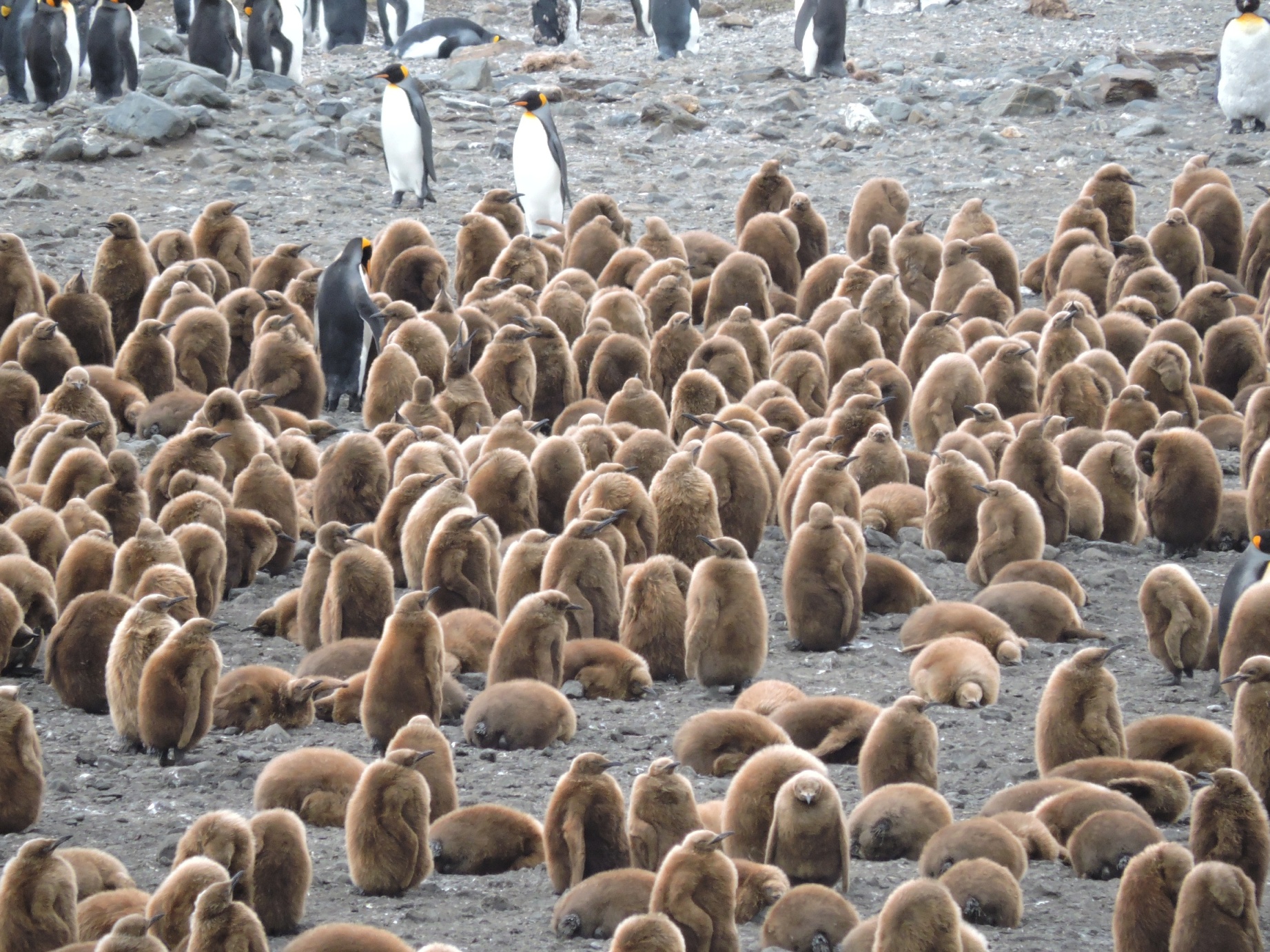 Ahead of us lay Fortuna Plain, backed by alpine mountains and ice fields inland and lower, less-craggy mountains on the two sides.  We had come here to see a king penguin rookery, which is situated about a mile inland along the west side of the valley.  King penguins were spread out from the beach all the way back to the rookery and beyond.  Many of the adults we passed were molting.  This indicated the breeding season is almost over, at least for this group, and we could expect to see fully grown chicks back at the rookery. And, that is precisely what we saw…thousands of ‘oakum boys.’  The name comes from the brown, wooly-looking down coats they sport at this time of their lives.  Sailors of old thought they looked like big bundles of oakum, which is tarred fibrous material (usually made from old pulled apart hemp ropes) used to caulk wooden ships.  Modern vessels made of steel or fiberglass have no need for oakum.  The adults stop feeding their big chicks about now and the fledglings have to wait until their juvenal plumage molts in before they can go to sea and start feeding themselves.  As we gathered on a low hill overlooking the grand sight of the colony, it was strangely reminiscent of the plains of Africa, only with penguins instead of wildebeest.This was our rendezvous point for the trekkers that we left ashore back at King Haakon Bay a couple days ago.  It was good to watch them descend into Fortuna Bay and then rejoin their compatriots aboard ship.  They had some wonderful stories to tell about their adventures.