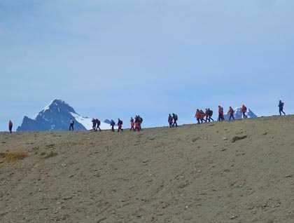 This morning, most of our guests traded mud boots for hiking boots and mustered at Worsley Beach in Fortuna Bay so we could follow the in footsteps of the final 6km of Shackleton’s crossing of South Georgia. At the beginning of the hike, hundreds of Fur Seals hid in tussock lumps like so many snipers, waiting to pounce the unwary. Our guide Santiago led the way and minimized and disturbance to locals and visitors alike.