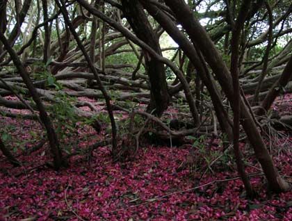 After lunch in a local restaurant, we explored the Lost Gardens of Heligan. The Tremayne family lived for over 400 years at Heligan, but the gardens went untended after all 23 gardeners were killed in WWI. Work began on restoring Heligan gardens 25 years ago, and once again 23 gardeners care for it. The rhododendrons are massive; some are tree-sized. They were all blooming. Beneath some of them, the dirt was carpeted with deep pink flowers—it was magical. The gardens are quite varied and include open formal gardens with pools, curving paths beneath towering trees, lovely antique greenhouses, orchards, large kitchen gardens, and views of the sea beyond rolling green fields. Along the woodland path, a huge female figure appears to sleep peacefully on the ground, with mosses and plants keeping her green as she slumbers.