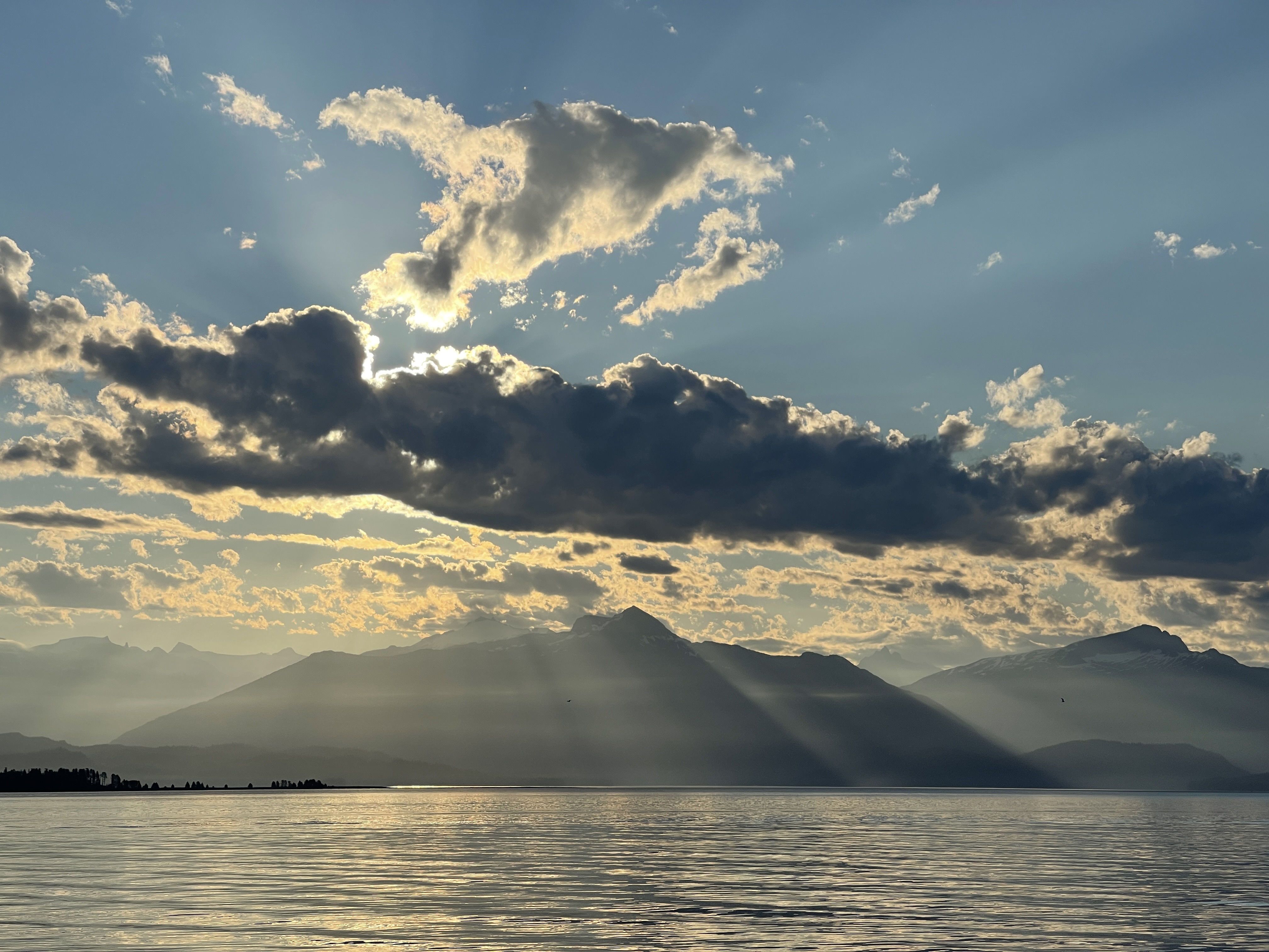 During an operational stop in Petersburg, we were treated to a panoramic view of the Coast Range with the 9,079 foot granite spire of Devils Thumb as a backdrop to the fleet of salmon fishing boats. We are heading south tonight to continue our great luck of finding whales and great weather. Stay tuned.