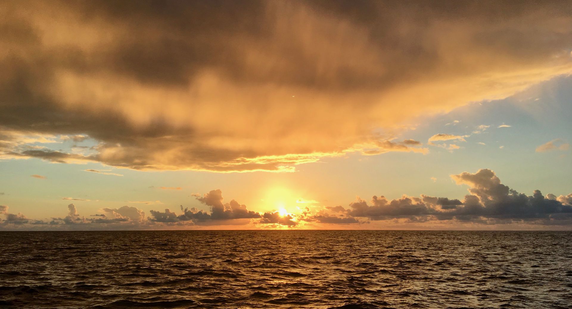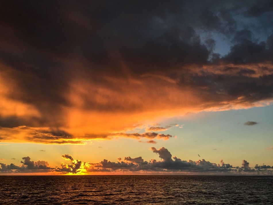 This is our second day at sea, crossing brilliant blue waters under bright sunshine in the far southeast corner of Polynesia. The incredible expanse of the Pacific, the largest physical feature of the planet, surrounds us and envelopes us in its own distinct world, in the true nature of our world, Planet Ocean. The surface of the earth is mostly ocean, more than twice as much water as there is land. Think about that. All the land you’ve ever seen, near your home and in distant destinations, around the car on long drives and far below on cross-country flights, multiplied by two, still doesn’t equal the area of all the world’s oceans. This may give a small window into the world we are traveling through now, with the deep blue water extending to the distant horizon all around us. The sky is the other half of this world, and it is as full and ever changing as the surface of the sea is featureless. The ocean changes day by day, sometimes in just a few hours, as storms and sets of swells come and go, but the cloudscapes of the tropical Pacific change every minute, from the first light before sunrise until the light fades again in the evening. There is almost always a beautiful layer of small, puffy cumulus clouds low over the sea, moving quickly in the surface winds. Sometimes the larger ones trail grey tails of heavy rain below their flat bottoms, squalls that come and go in a few minutes. Much higher in the sky there are multiple layers of cirrus and alto-cirrus, usually only wispy horsetails, sometimes gathering into broad, textured mackerel skies. The sunrise and sunset light play through these various clouds like a symphony, one layer after another, golds and pinks and purples swelling and fading like movements of music, building to a crescendo, then slowly fading into day or darkness. This is the true face of Planet Ocean, our home.
