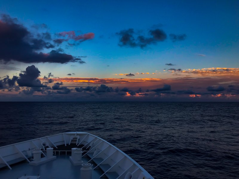 After two fabulous nights on Easter Island it was time to begin the sea portion of our voyage through Polynesia. We boarded our new home last night, and set off to the northwest towards the Pitcairn group. Our journey to our first island, Ducie, will take two full days at sea. A fiery sunrise started our day. After a breakfast on the outer deck, it was time to wrap up our times spent on Easter Island and move on to the plans ahead. We learned about photography, navigation, and Polynesian culture. A few seabirds passed by and flying fish darted off in front of the vessel. But mostly, today was about getting used to the ship, and enjoying the beautiful conditions. Whether out on deck or merely staring out the window, the cobalt blue ocean was mesmerizing.