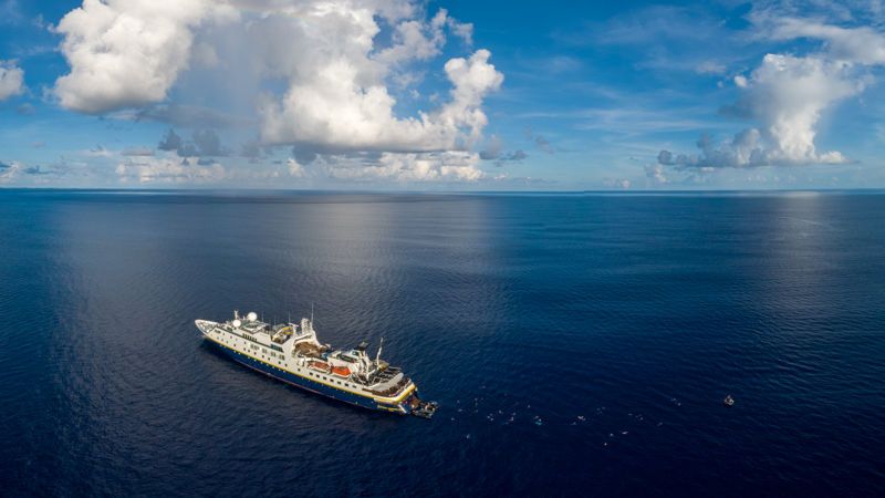 When you explore the South Pacific by ship it is inevitable that you will have to have a day at sea to navigate the vast distances between the many islands and atolls. Although, a day at sea is never a ‘wasted’ day onboard National Geographic Orion ! We enjoyed a few fascinating lectures from our natural history staff, had time to catch up on editing our photos with our photography instructors, and – of course – feasted on the many delicious meals prepared by our outstanding galley and hotel teams. But, the highlight of our day had to be a blue water swim in over 6000 feet of crystal clear blue water right in the middle of the South Pacific!