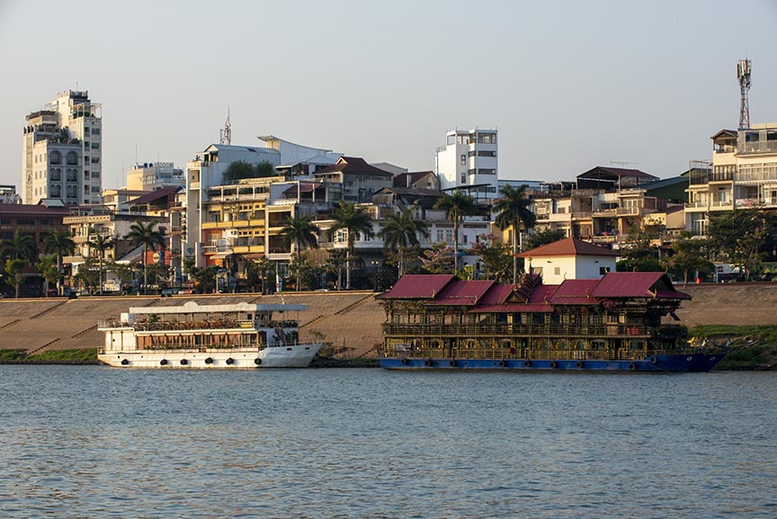 On The Jahan, our photo instructor Sue led an early morning photo walk in Phnom Penh by tuk tuk to a waterfront park on the Mekong and at Wat Ounalom Monastery, the center of Cambodian Buddhism. The group photographed locals exercising in the park and a ceremony at the monastery. After breakfast, University of Phnom Penh Professor and Linguist Jean Michel Filippi gave a lecture covering the past 70 years of Cambodian history. We took a break for fresh coconuts on deck before a Q&A session in the lounge. During the afternoon, National Geographic Archeologist Fabio Esteban gave a talk about “The Power of Art”. Then, we took local tuk tuks through the village of Kampong Leaeng to visit a local pottery artisan. We also learned about palm sugar production with a demonstration on a farm and watched the locals climbing the palm trees to collect the sap, which is later boiled to thicken it. After dinner, Expedition Leader David Brotherson gave a presentation about “Cambodian Weddings”, sharing his experience and the many costume changes involved.